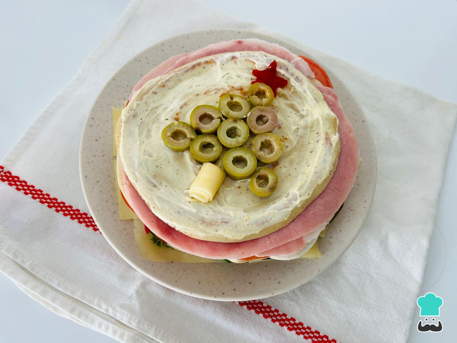 Unta el último panqueque y decora con un árbol para darle el toque navideño. Para hacerlo, usa las aceitunas en rodajas y un rollito de queso de máquina para el tronco. Termina con una estrella hecha con morrón asado o también podrías usar tomate.