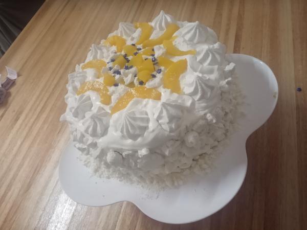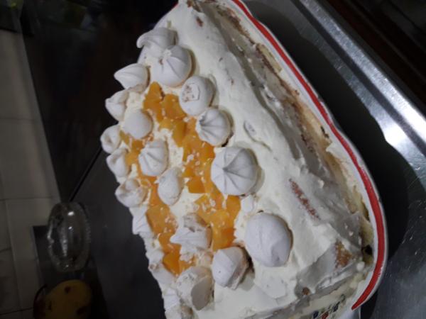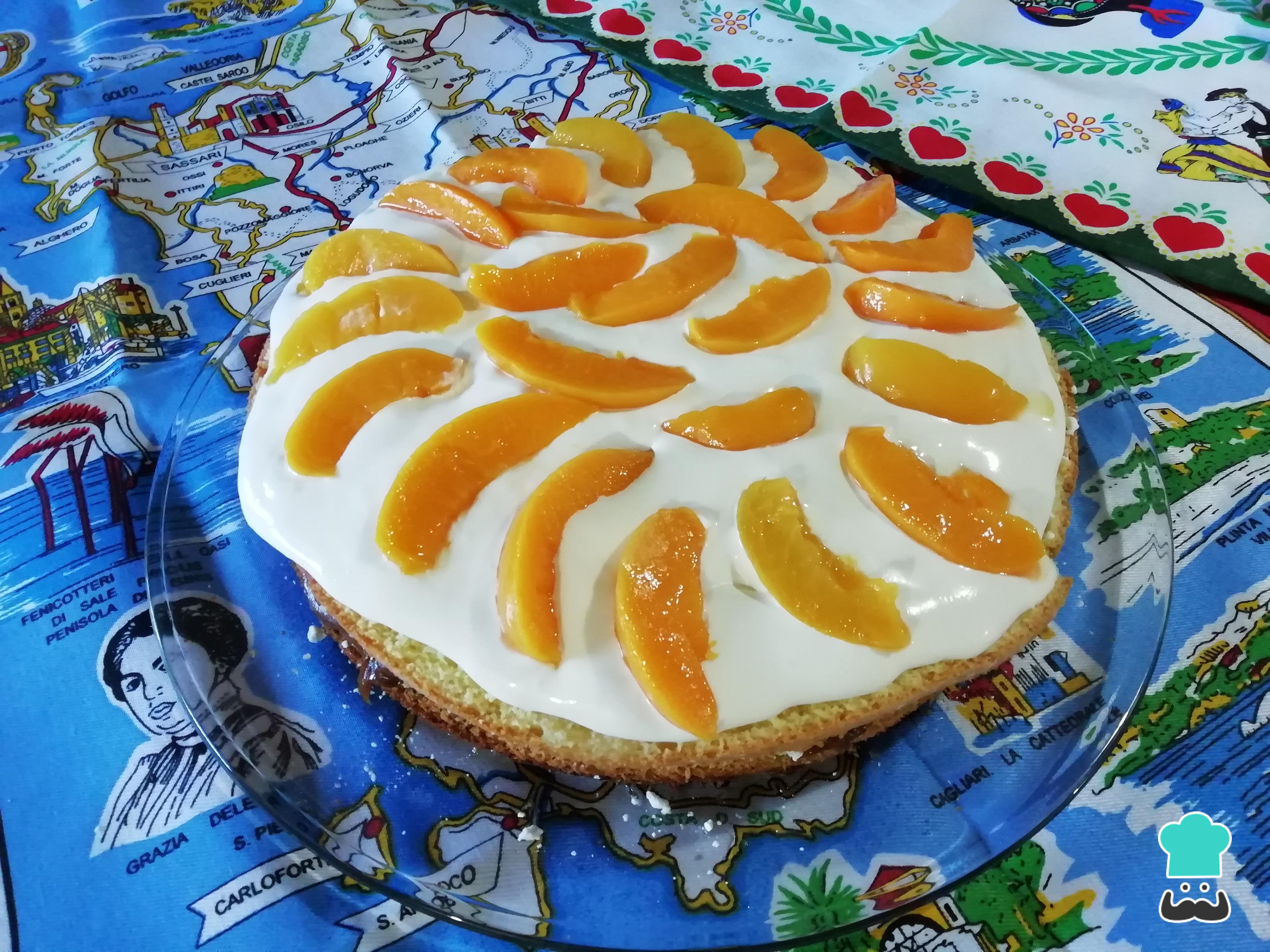Coloca, por encima, la segunda capa que cortaste del bizcochuelo y moja con el almíbar. Vuelca parte de la crema chantilly y reserva una parte para el forrado. Por encima de la crema, coloca los melocotones cortados en rodajas o en cubos.
