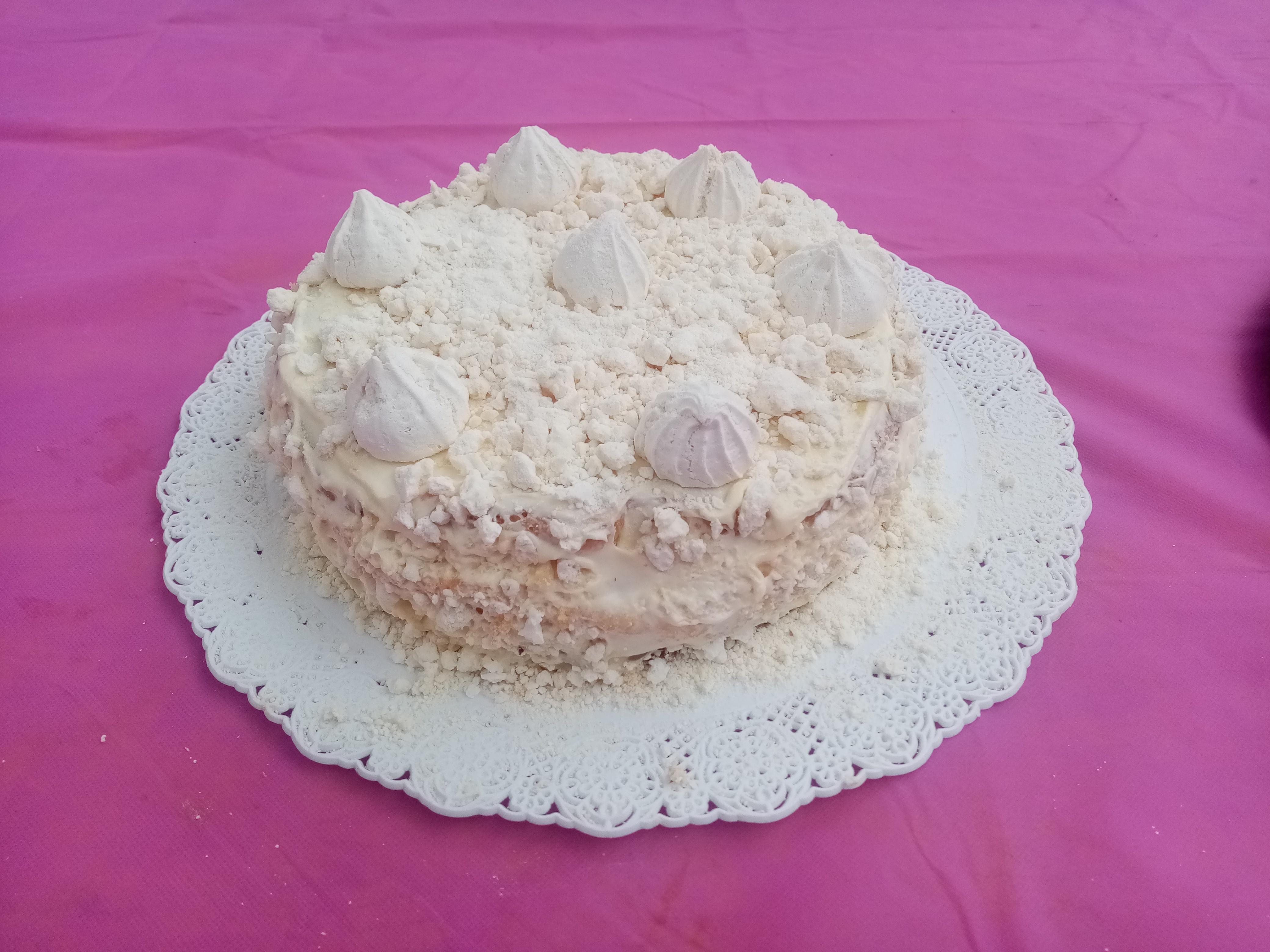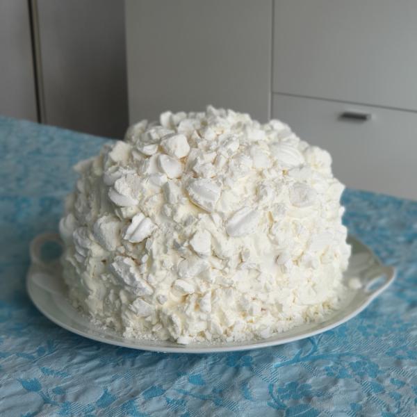 Pon una tercera y última capa de bizcochuelo sobre el postre. Nuevamente, repite el mismo procedimiento y coloca la crema restante, esparciéndola por todos los lados. Rompe más merengue y ve cubriendo la torta a lo largo de toda su superficie. Déjalo refrigerar por al menos 3 horas ¡y disfruta de esta deliciosa torta chajá!