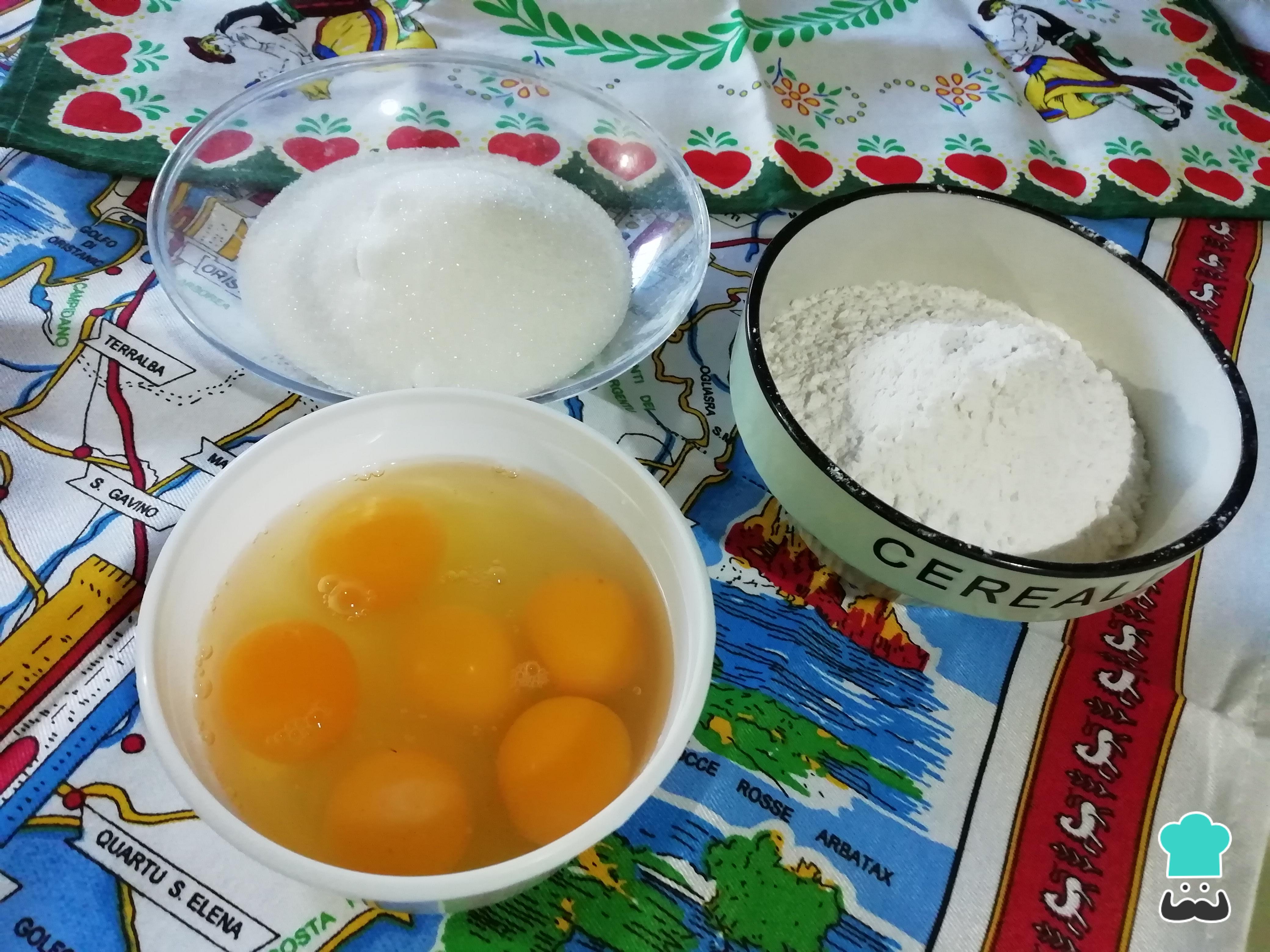 Para preparar la torta chajá, deberás, en primer lugar, elaborar el bizcochuelo esponjoso. Reúne todos los ingredientes para ello.
