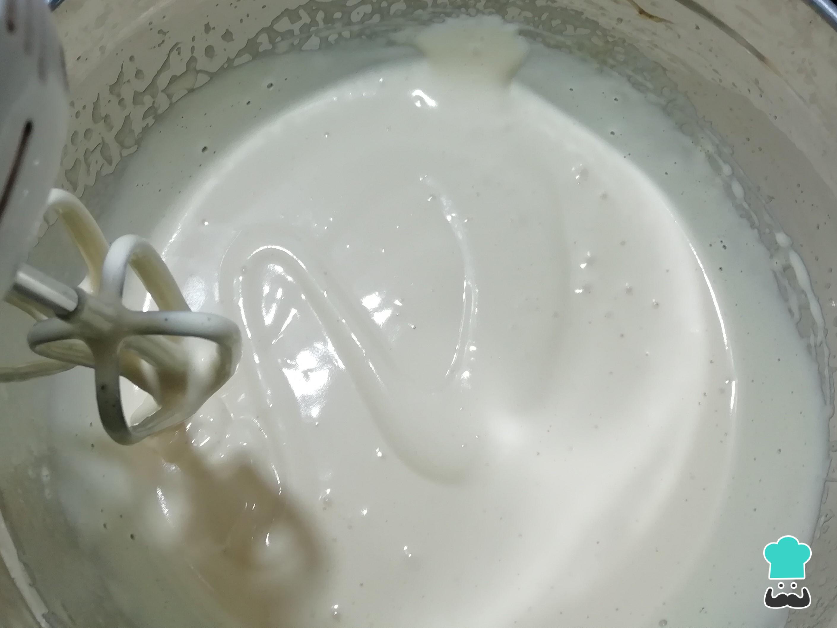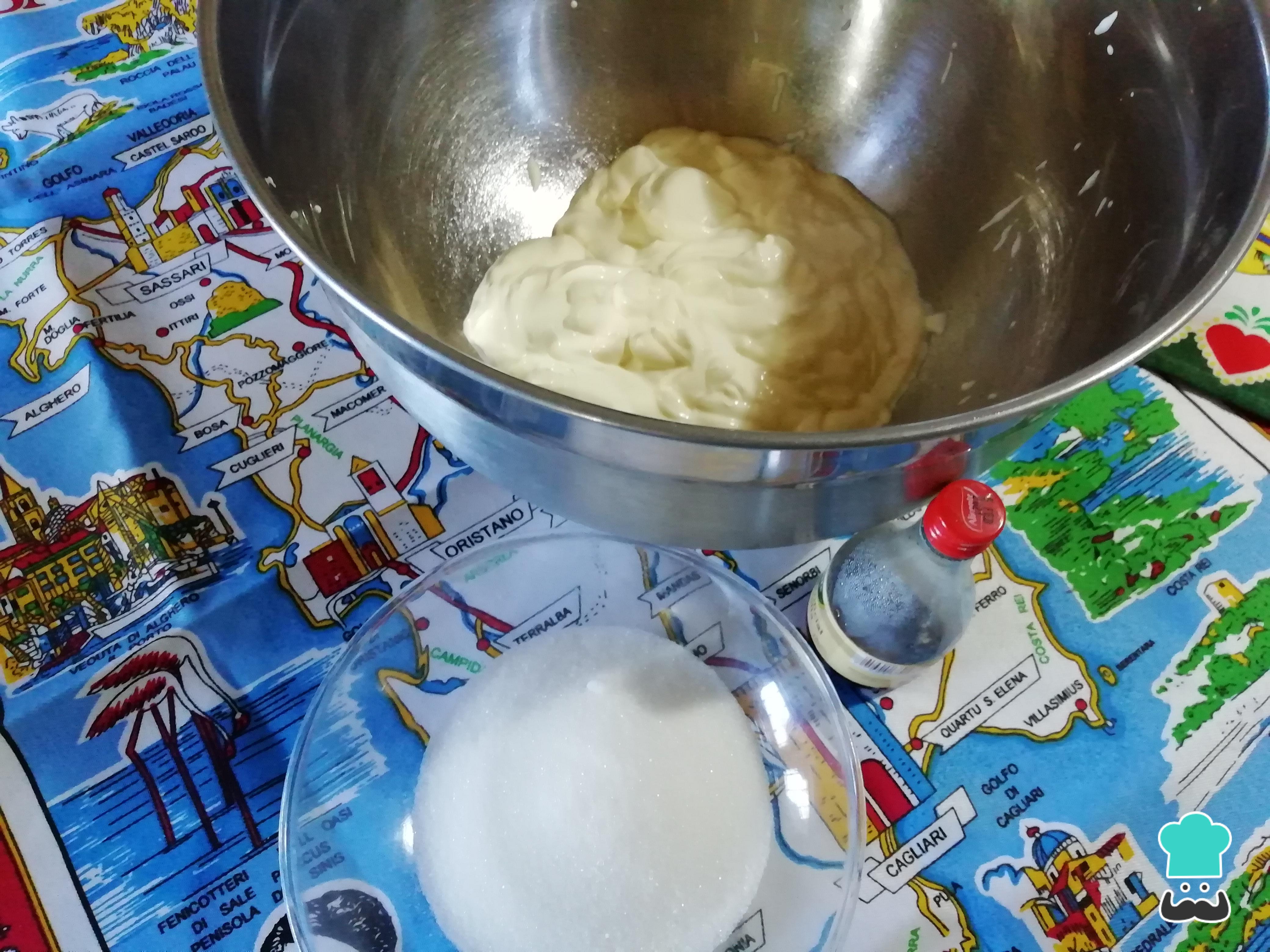 Ahora, bate la crema, los 100 g de azúcar y la esencia de vainilla hasta que la crema quede montada.