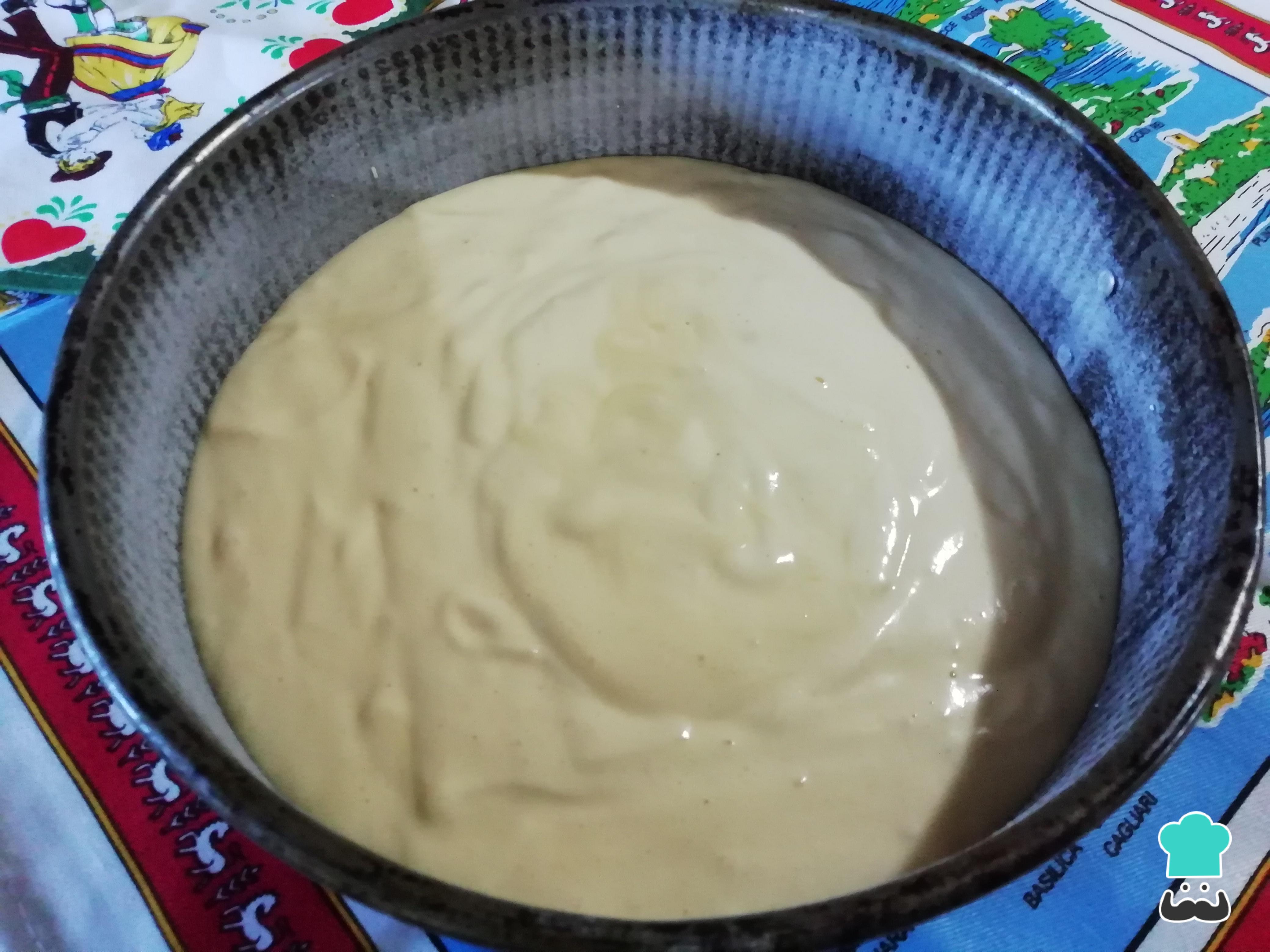 En un molde enmantecado y enharinado, coloca la mezcla. Hemos utilizado uno de 24 cm de diámetro, pero si tienes un molde de 20 cm, también te servirá.