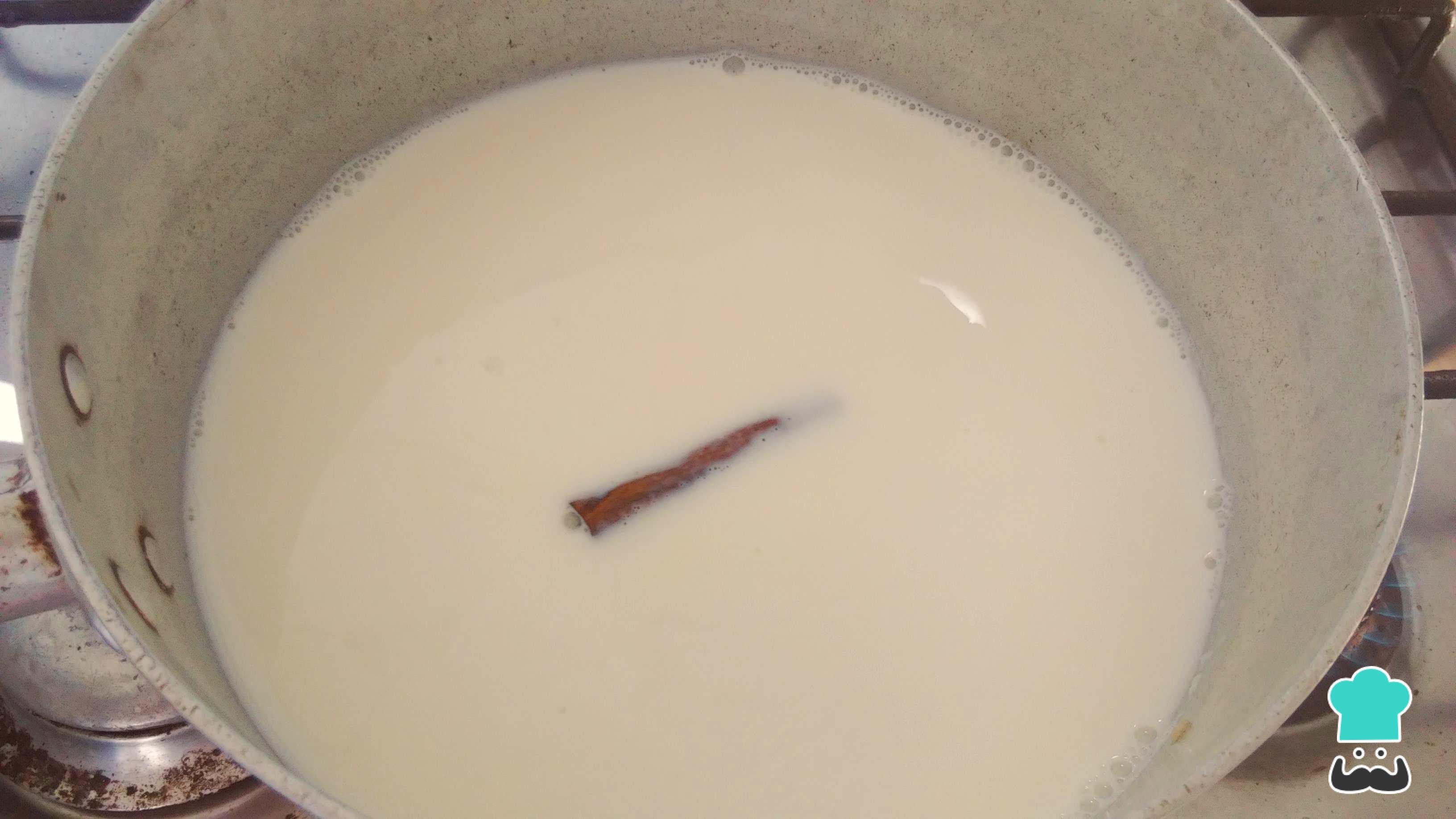 Después de pesar todos los ingredientes para la torta de pan tipo quesillo sin mantequilla, lleva al fuego la leche y los palos de canela. Deja la leche lo suficiente para calentarla, no es necesario que hierva. Agrega la vainilla y la cáscara de mandarina confitada para infusionar y extraer su sabor.