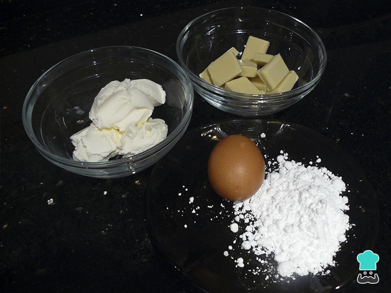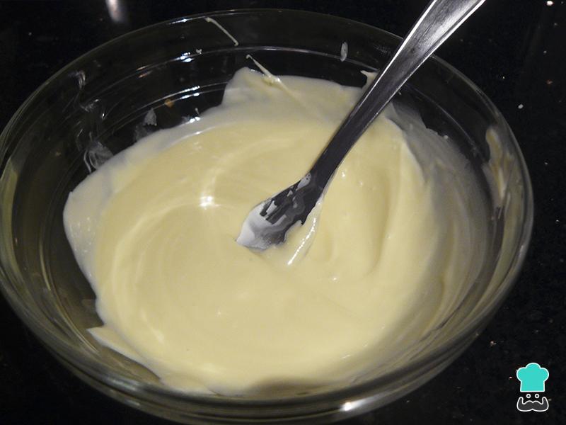 Deshacemos el chocolate blanco al baño maría. Esto es, en un cazo calentamos como un par de dedos de agua, y dejamos que alcance el punto de ebullición. En ese momento, colocamos sobre el cazo el bol con el chocolate blanco y lo diluimos poco a poco hasta lograr que esté suave.