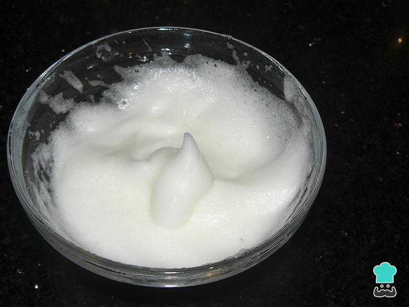 Montamos las claras al punto de nieve. Si ves que te cuesta aun con las varillas, puedes utilizar un poco de azúcar, pero no mucho.
