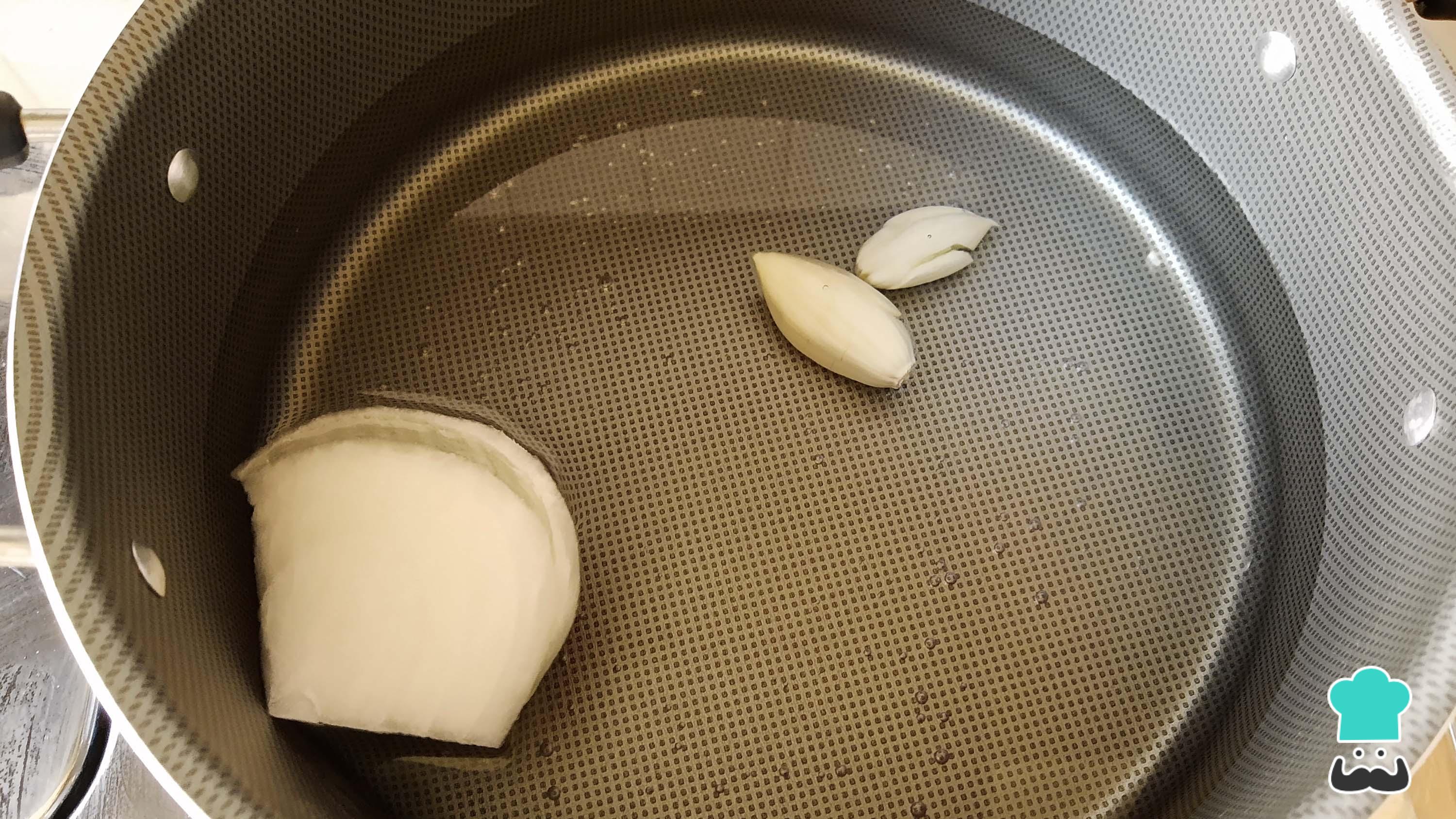 Para comenzar la receta de torta ahogada de camarón, calienta 3 tazas de agua, agrega un trozo de cebolla, además añade sal al gusto y dos dientes de ajo, deja hervir y reserva el agua, ya servirá para cocinar los camarones.
