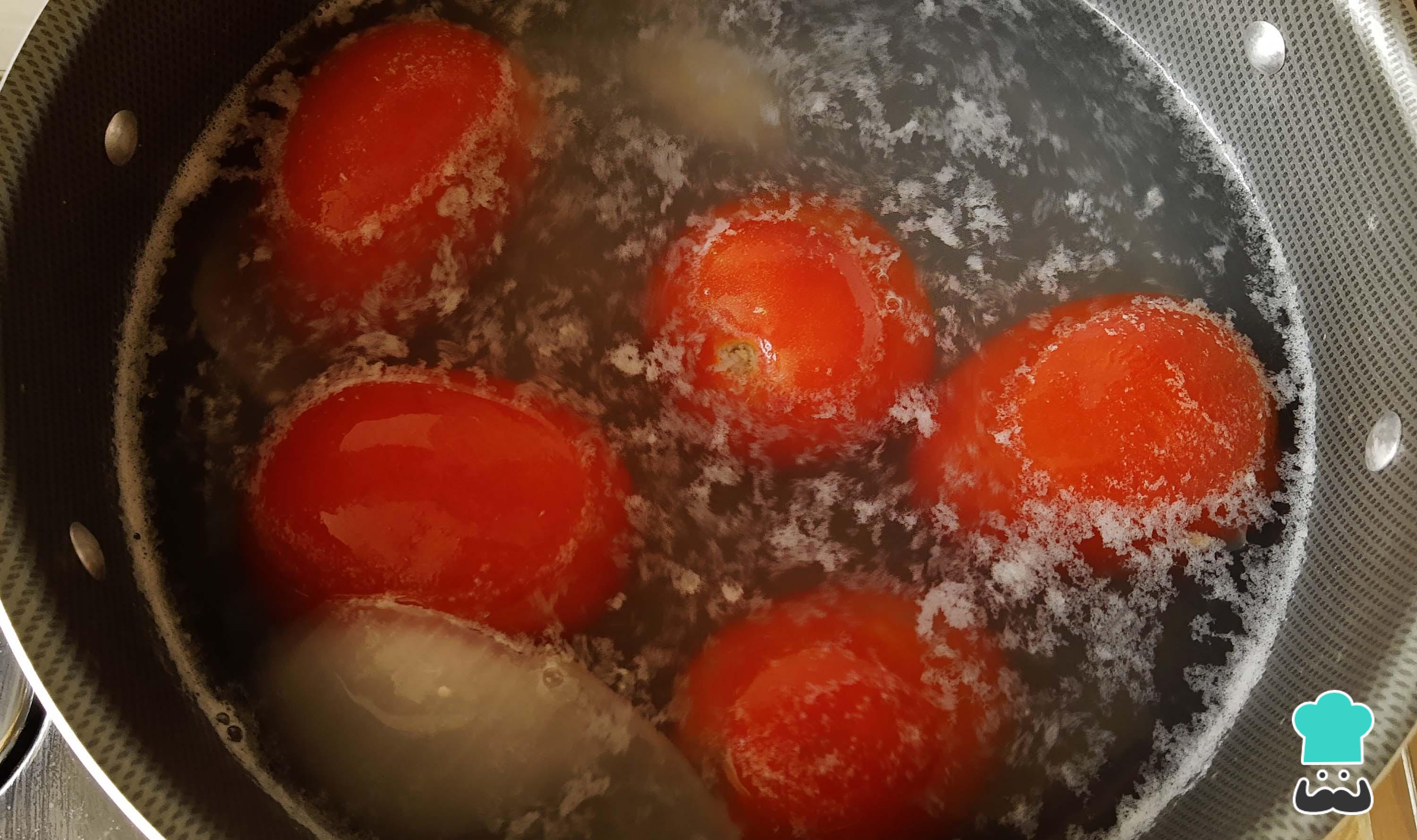 En la misma olla de la cocción de los camarones, agrega los jitomates y déjalos hervir por 5 minutos hasta que estén suavizados y la piel comience a desprenderse del jitomate.