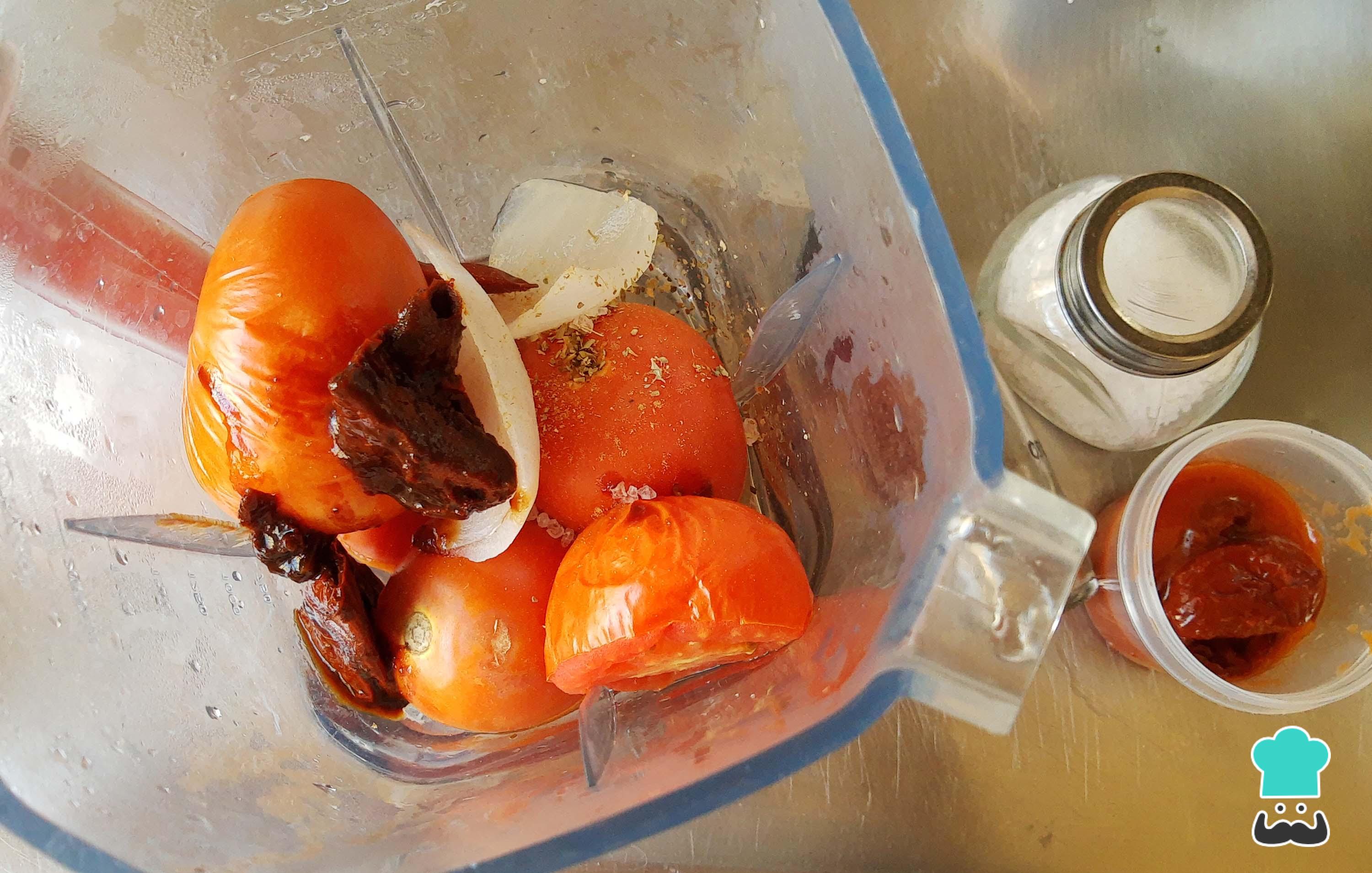 Luego licua los jitomates, el trozo de cebolla, los dientes de ajo cocinados con una pizca de sal y chile chipotle al gusto, con dos a 3 chiles bastarán para un picor moderado.