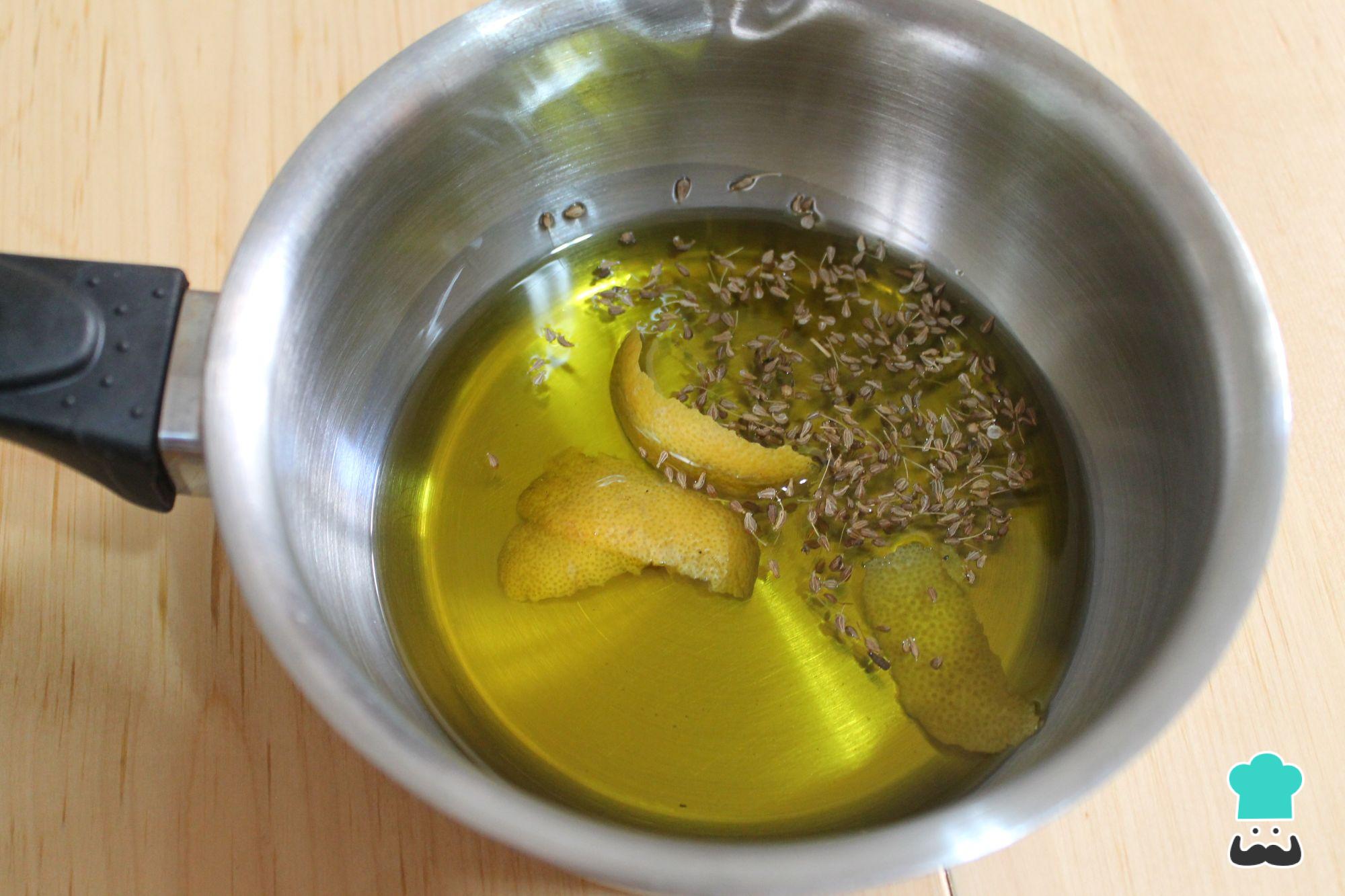 Añade en un cazo el aceite de oliva junto con la cucharadita de anís en grano y unas tiras de la piel del limón sin la parte blanca. Deja cocer durante 5 minutos a fuego suave y, luego, deja enfriar.