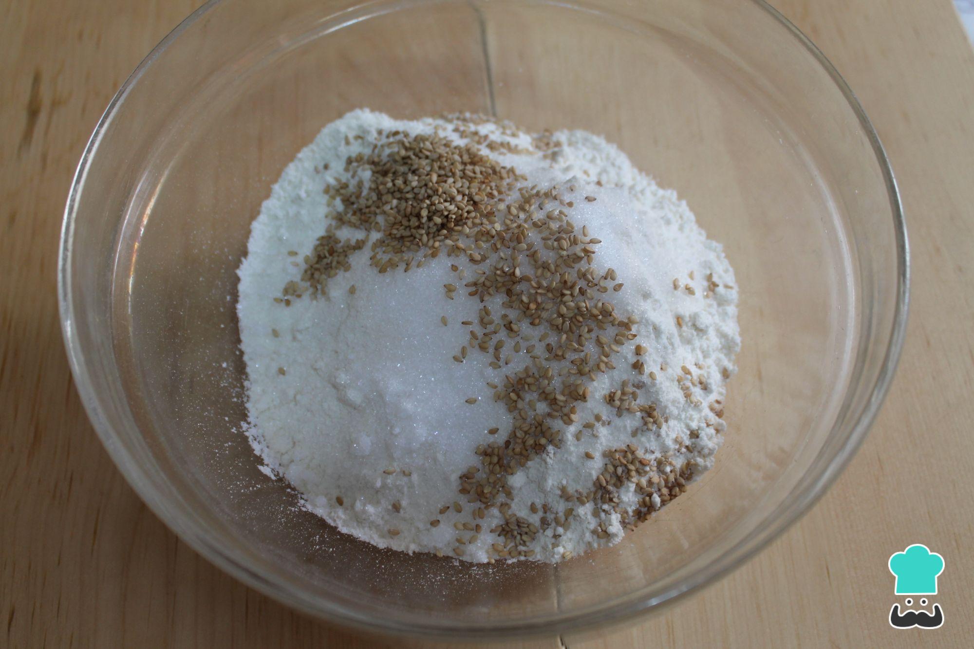 En un bol coloca la harina junto con una pizca de sal, 25 g de azúcar, la levadura seca y el sésamo tostado. Remueve con una espátula.