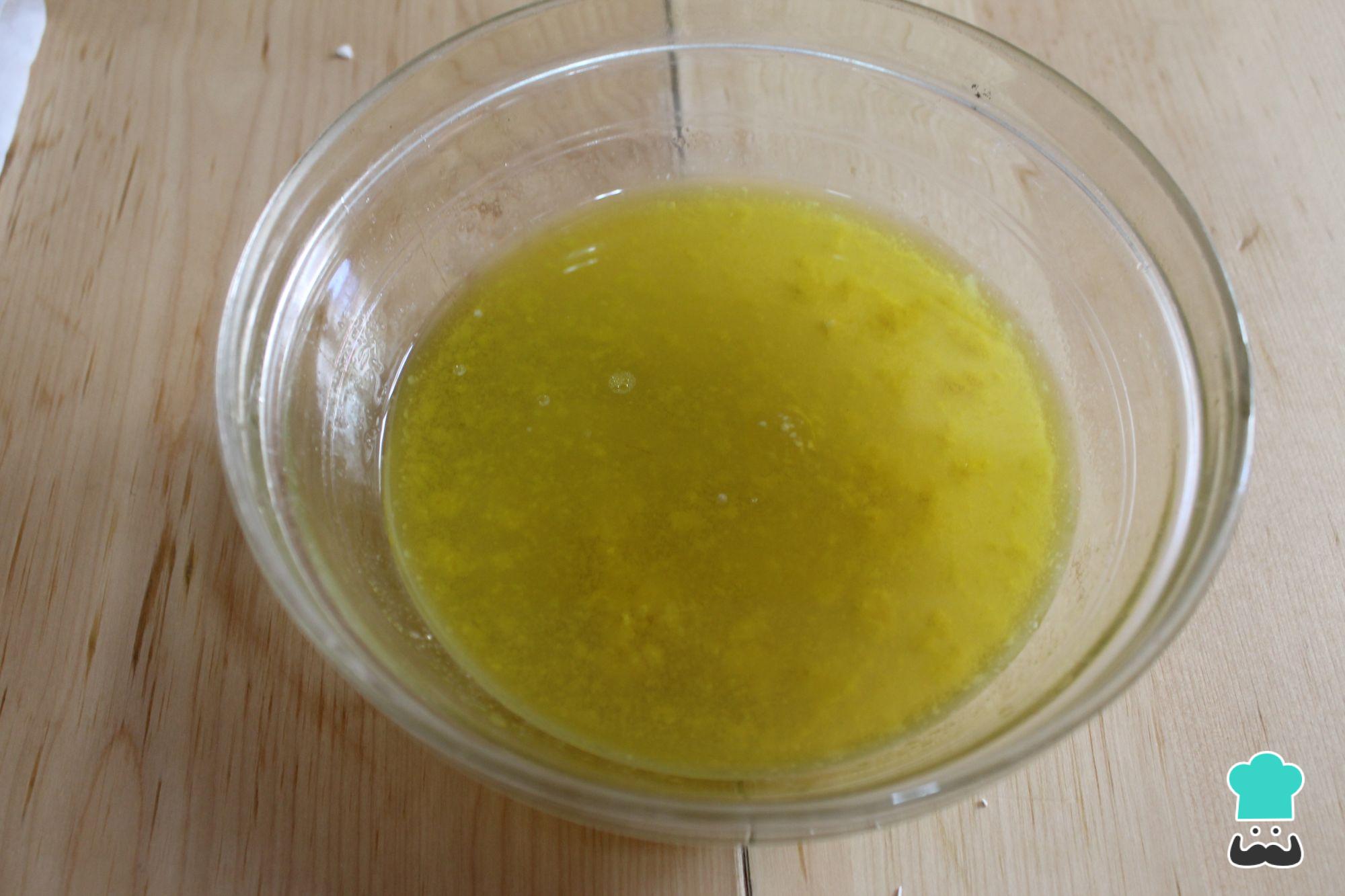 En otro bol cuela el aceite infusionado con la piel de limón y el anís en grano. Añade el agua y el licor de anís, mezcla bien.