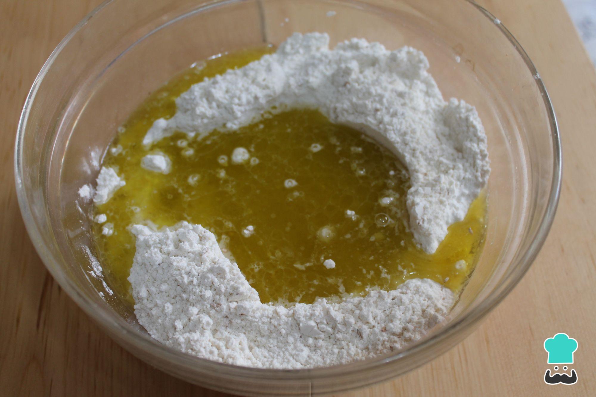 Haz un hueco en el centro del bol con la harina, el azúcar y la levadura y vierte en el centro la mezcla de aceite, el agua y el licor. Ve mezclando bien con una espátula. Después, amasa con las manos, debe quedar una masa elástica que no se pegue en las manos. Si ves que la masa está demasiado blanda o líquida, añade un poco más de harina. Si por el contrario, ves que la masa está seca, añade un poco más de agua hasta que sea una masa manejable que no se pegue pero que se maneje bien.