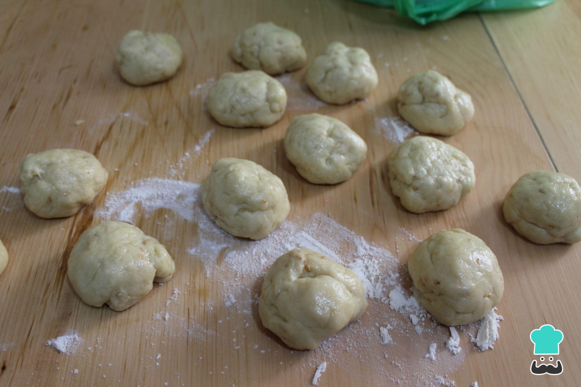 Cuando la masa haya levado, desinfla con las manos y corta porciones de unos 30 gramos aproximadamente. Forma unas bolitas con cada porción.