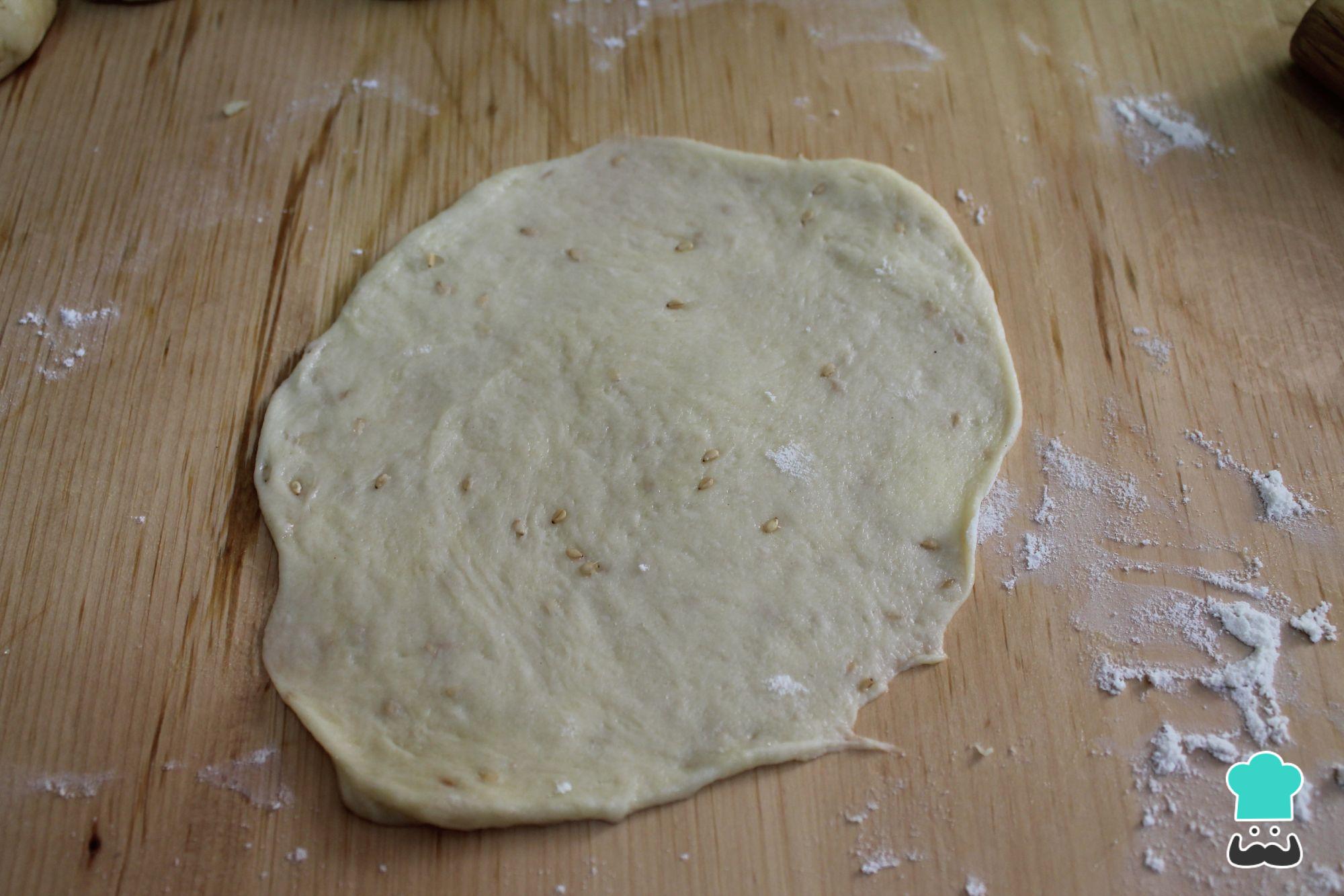 Enharina una superficie de trabajo y estira cada bolita con un rodillo dejando una torta finita.