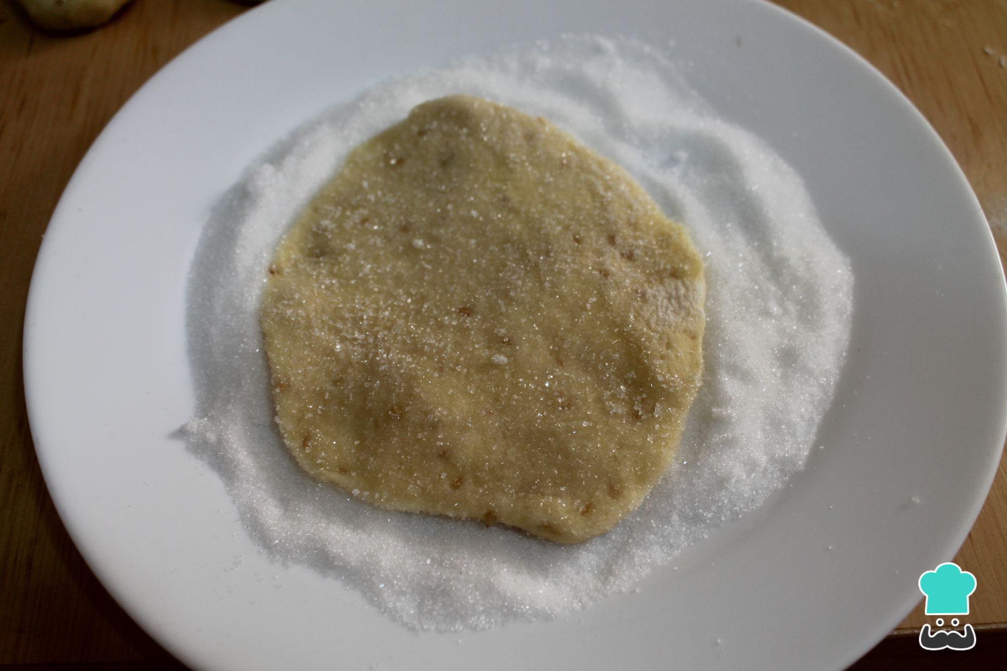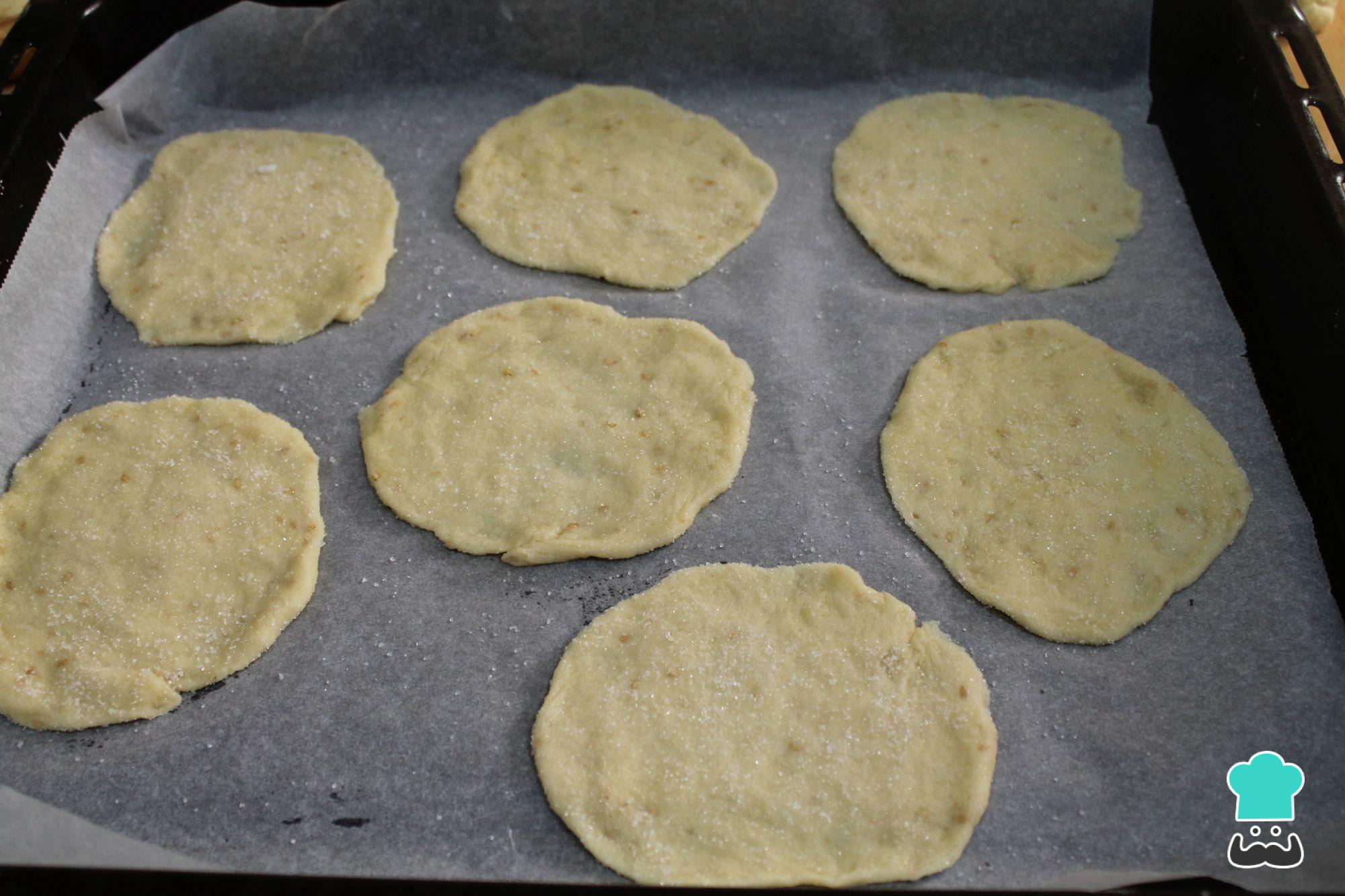 Reboza las dos caras de la torta con 75 gramos de azúcar y ve depositando las tortas en una bandeja con papel de horno.