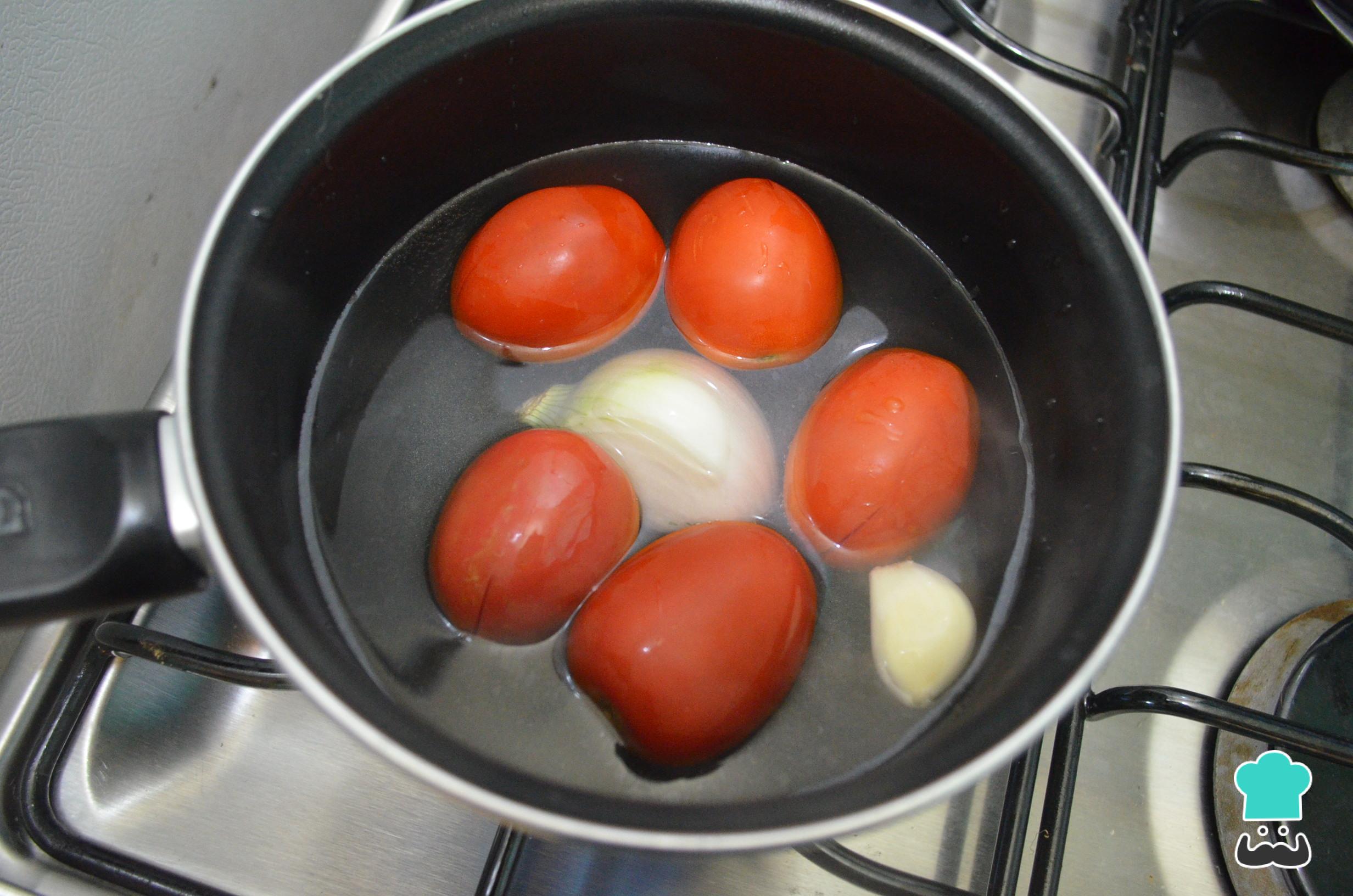 Hervir los jitomates en una cacerola con poca agua, junto con la cebolla y el ajo.