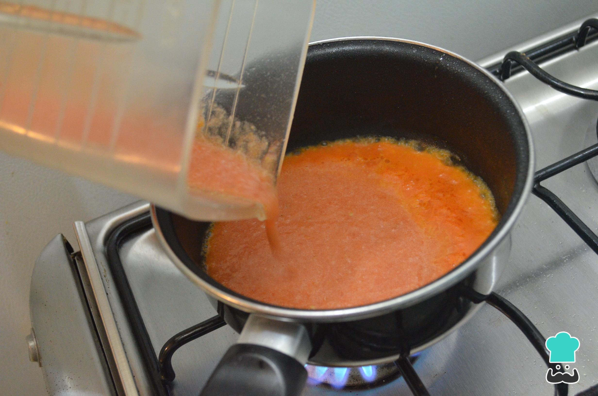 Vaciar la salsa de jitomate en una cacerola ya caliente con una cucharadita de aceite, cocer a fuego medio por diez minutos y rectificar espesor. La salsa no debe quedar ni muy aguada ni muy espesa.