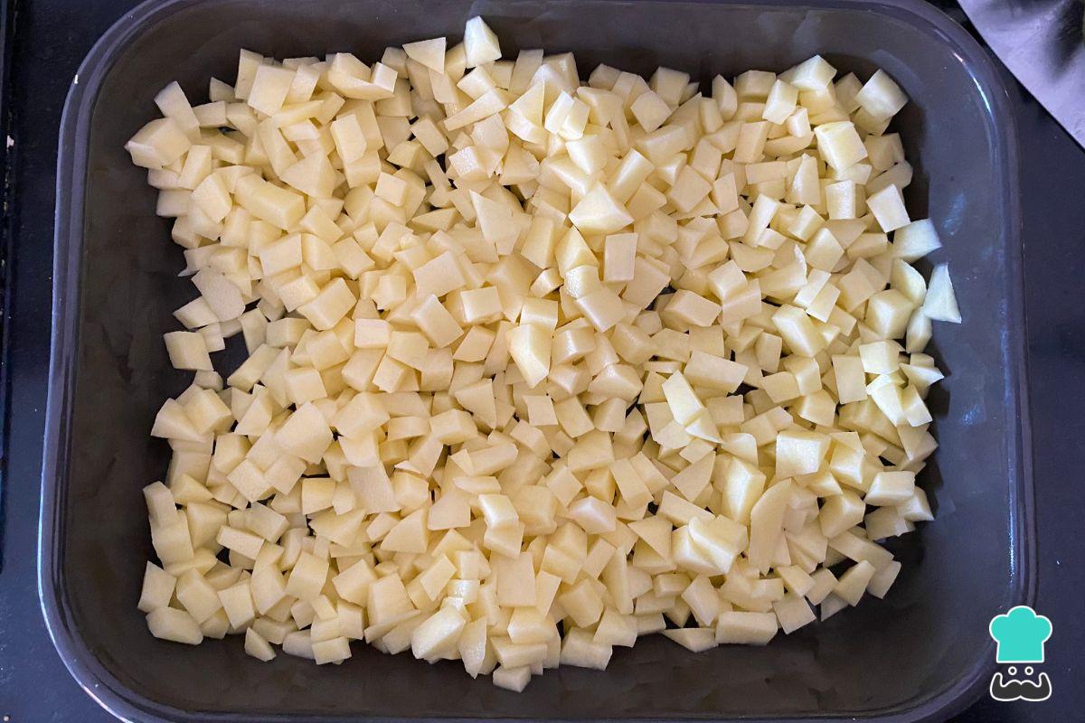 Para hacer la tortilla campera lo primero que deberás hacer es pelar y cortar en dados las patatas que llevará el plato. Aunque lo tradicional en la zona es cortar las patatas en dados, realmente podrás cortarlas como más te gusten. Una vez cortadas y lavadas, añade las patatas a una cacerola con abundante aceite hasta que estén bien fritas.