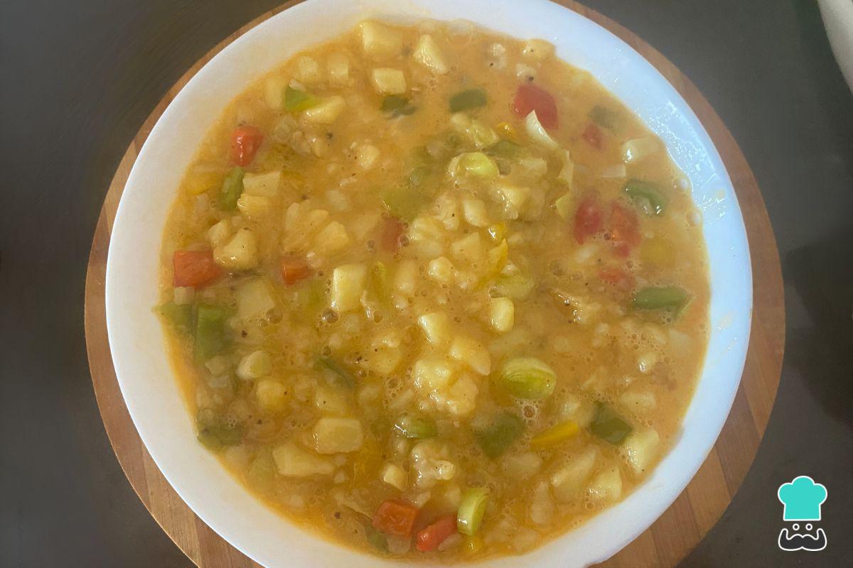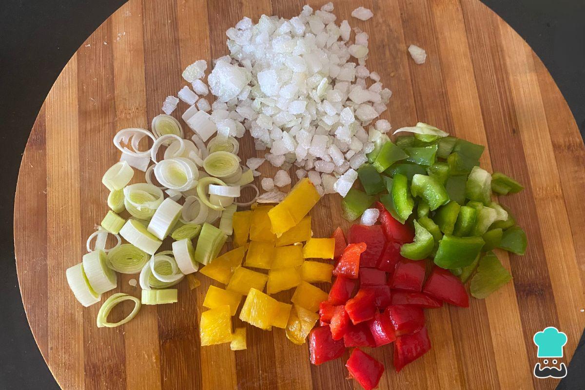 Mientras las patatas se encuentran en el fuego, prepara el resto de ingredientes. Corta la cebolla, el puerro, el pimiento verde, el pimiento rojo y el pimiento amarillo de un tamaño parecido para que se haga a la vez.