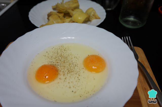 Para empezar con la receta de tortilla de alcachofas de bote receta, primero rompe 2 huevos en un plato. A continuación, bate bien con un poco de sal y pimienta.