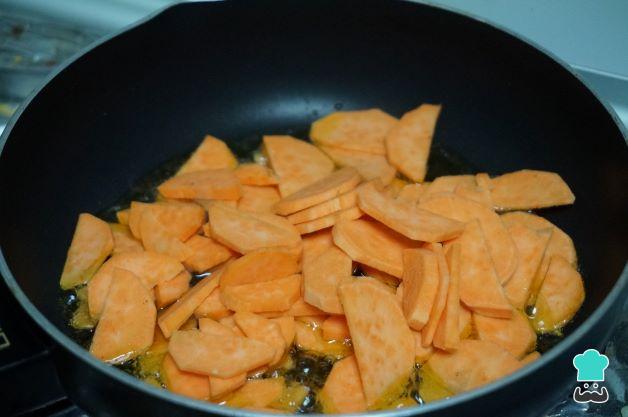 Coloca una sartén con un buen chorro de aceite y añade las rodajas de boniato, fríe como unas patatas. Remueve de vez en cuando para que se vayan dorando por todo. Cuando estén listas, retira y escurre bien del aceite.