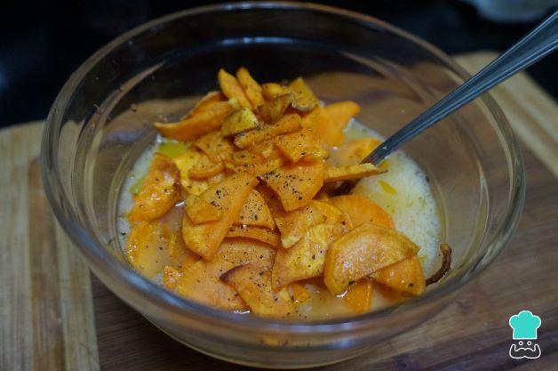 Al bol con los huevos añade el boniato frito, mezcla y deja reposar 2-3 minutos.
