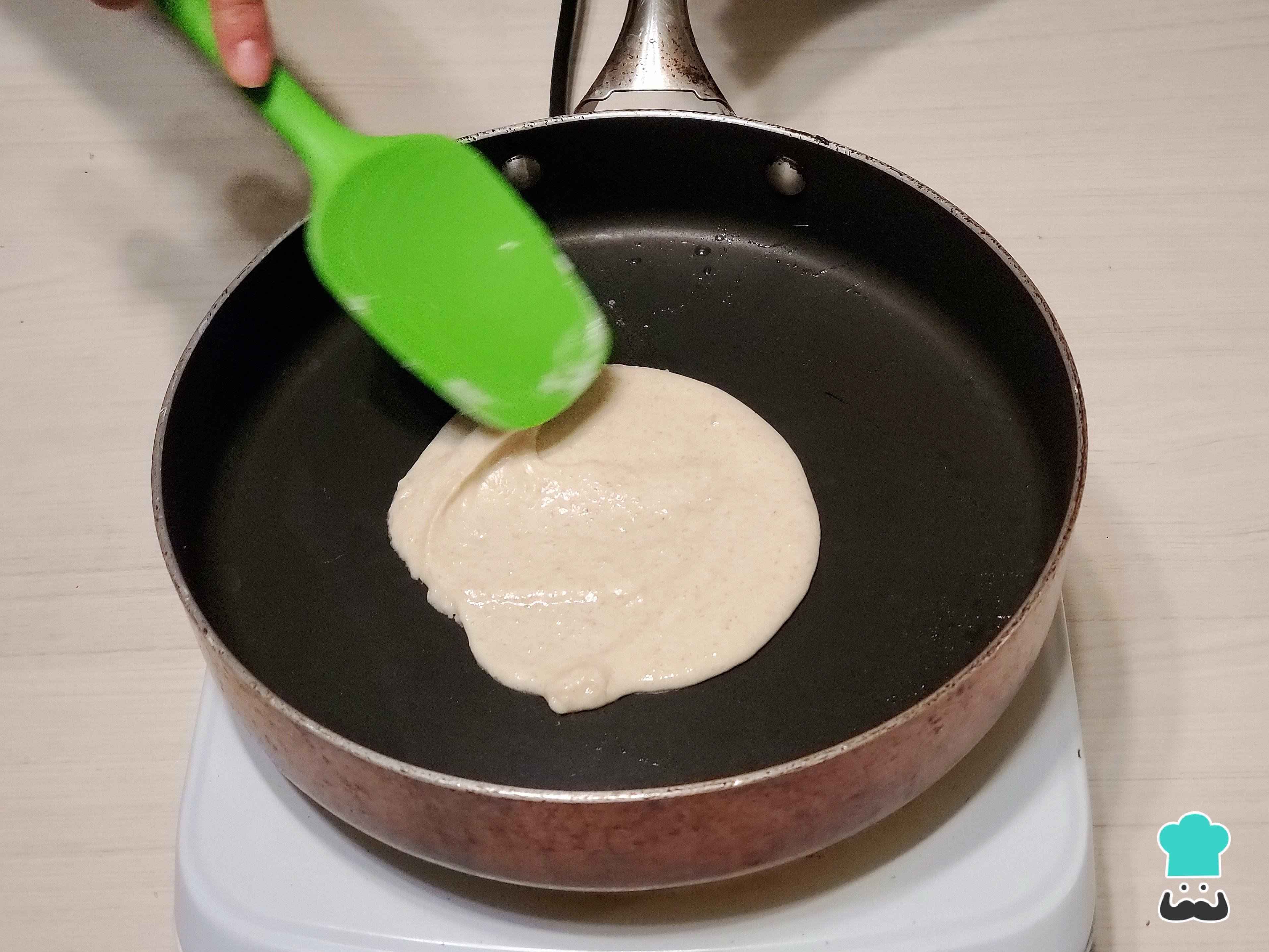 Para cocinar las tortitas de avena para desayuno o merienda, calienta una sartén o plancha antiadherente y unta un poco de aceite. Puedes usar papel absorbente para distribuirlo de forma pareja. Vierte un cucharón de la masa y espárcela con una espátula de goma, dándole forma circular. Mientras más delgada la hagas, más rápido se cocinará.