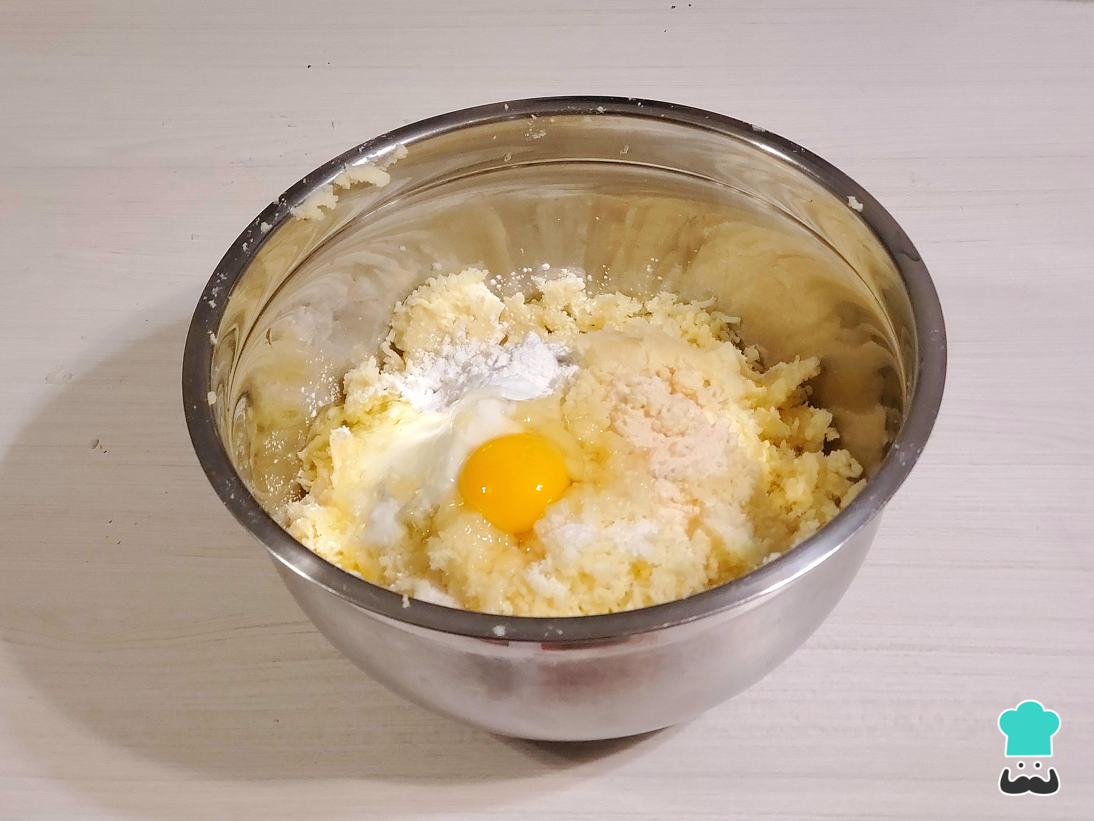 Sazona la masa de papa con una cucharada de sal, ajo en polvo, pimienta molida, el huevo y la maicena.