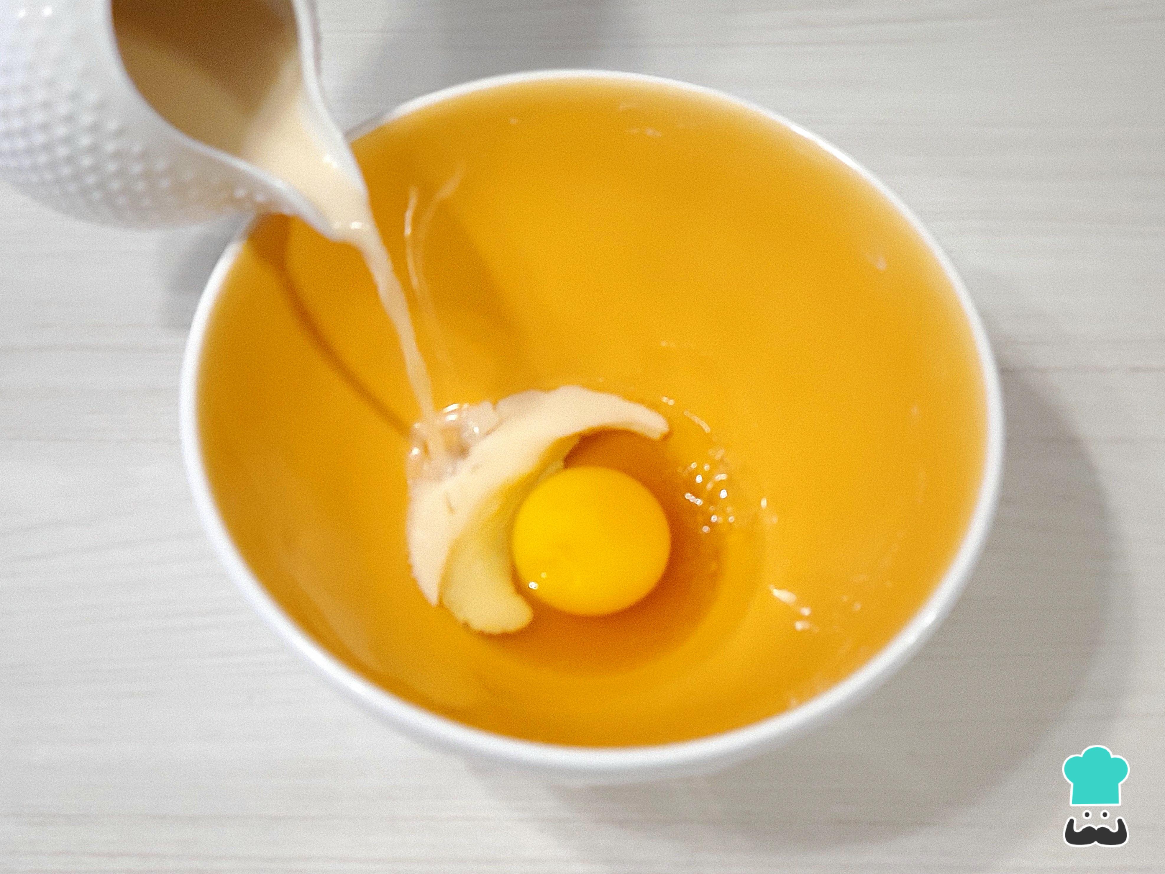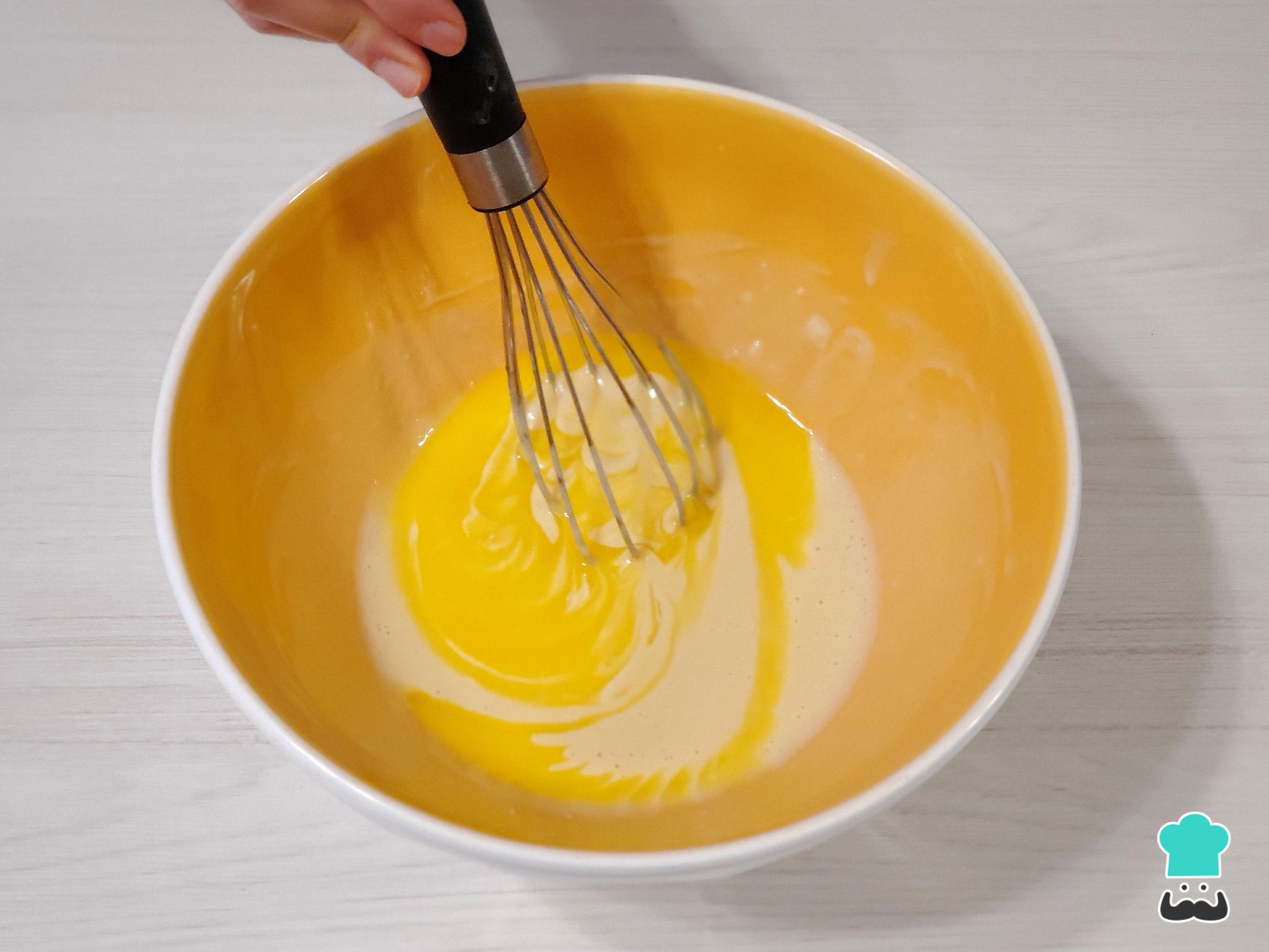 En un bowl mezcla todos los ingredientes líquidos, es decir, los huevos, la miel, la leche y un chorrito de esencia de vainilla. Mezcla bien y reserva. Si deseas puedes sustituir la miel por miel de maple, stevia, monkfruit (según las equivalencias) o plátano machacado.
