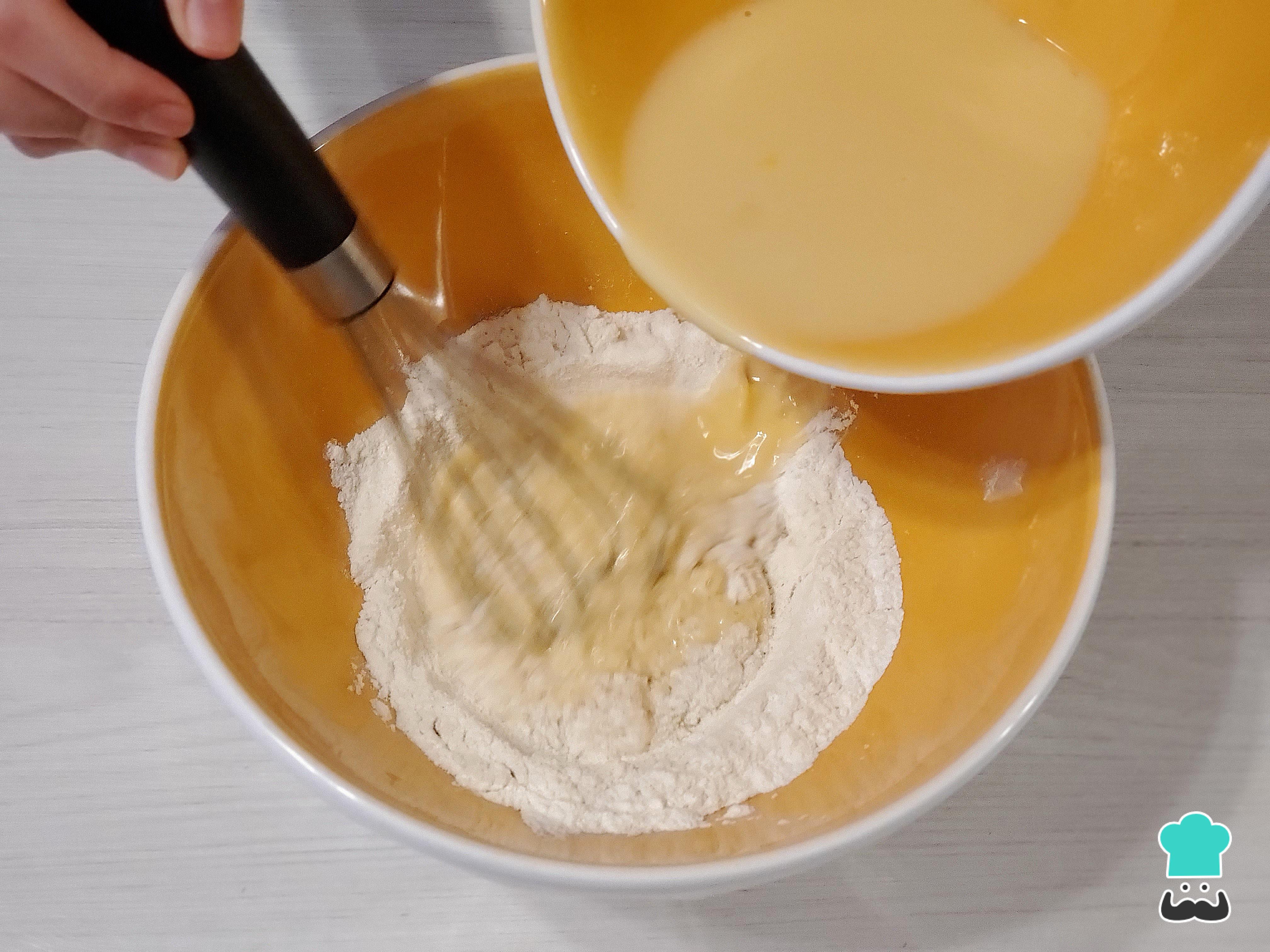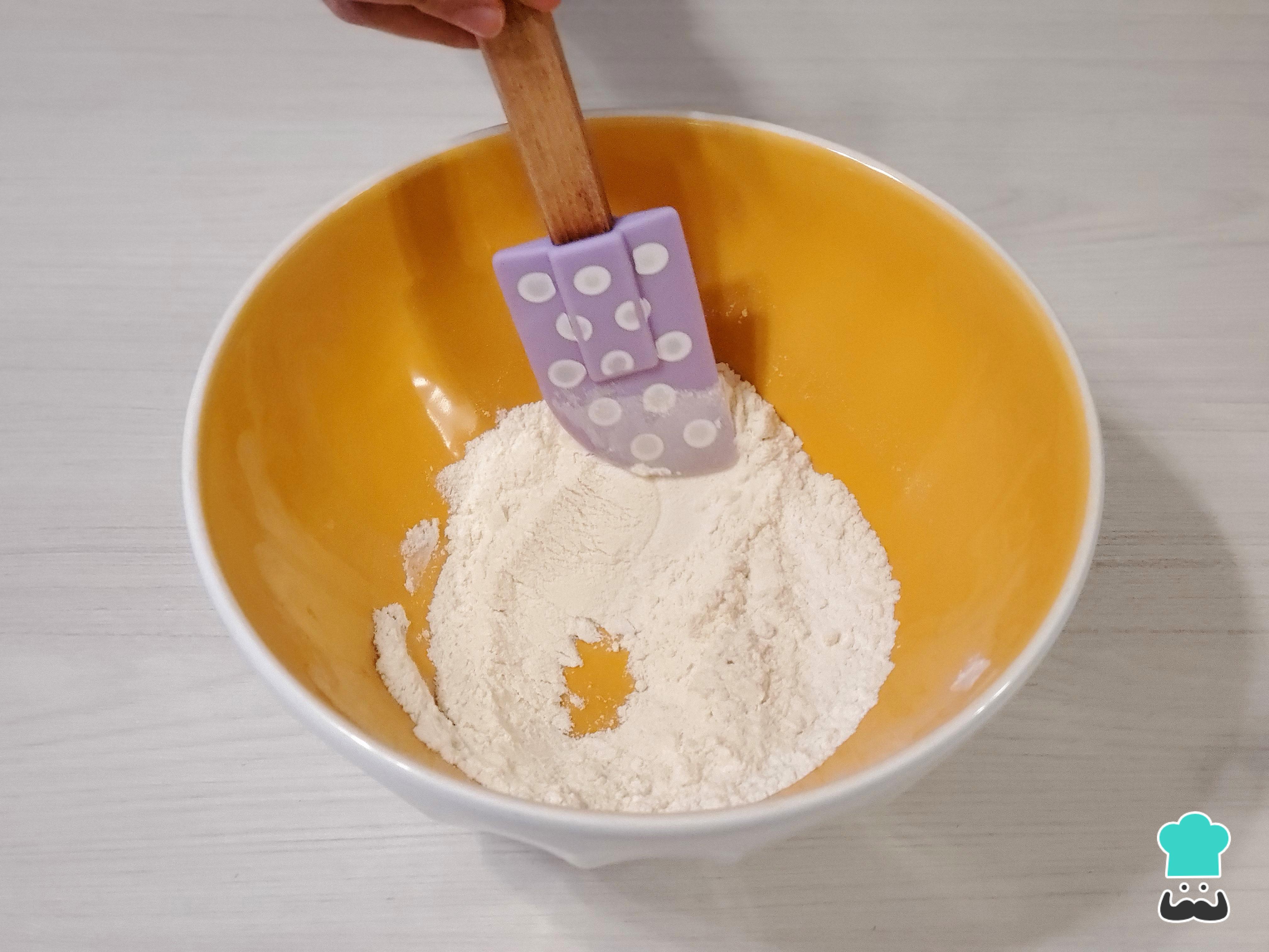 Aparte, en otro bowl cierne los ingredientes secos que son la harina, el polvo de hornear y una pizca de sal. Forma un hueco en el centro.
