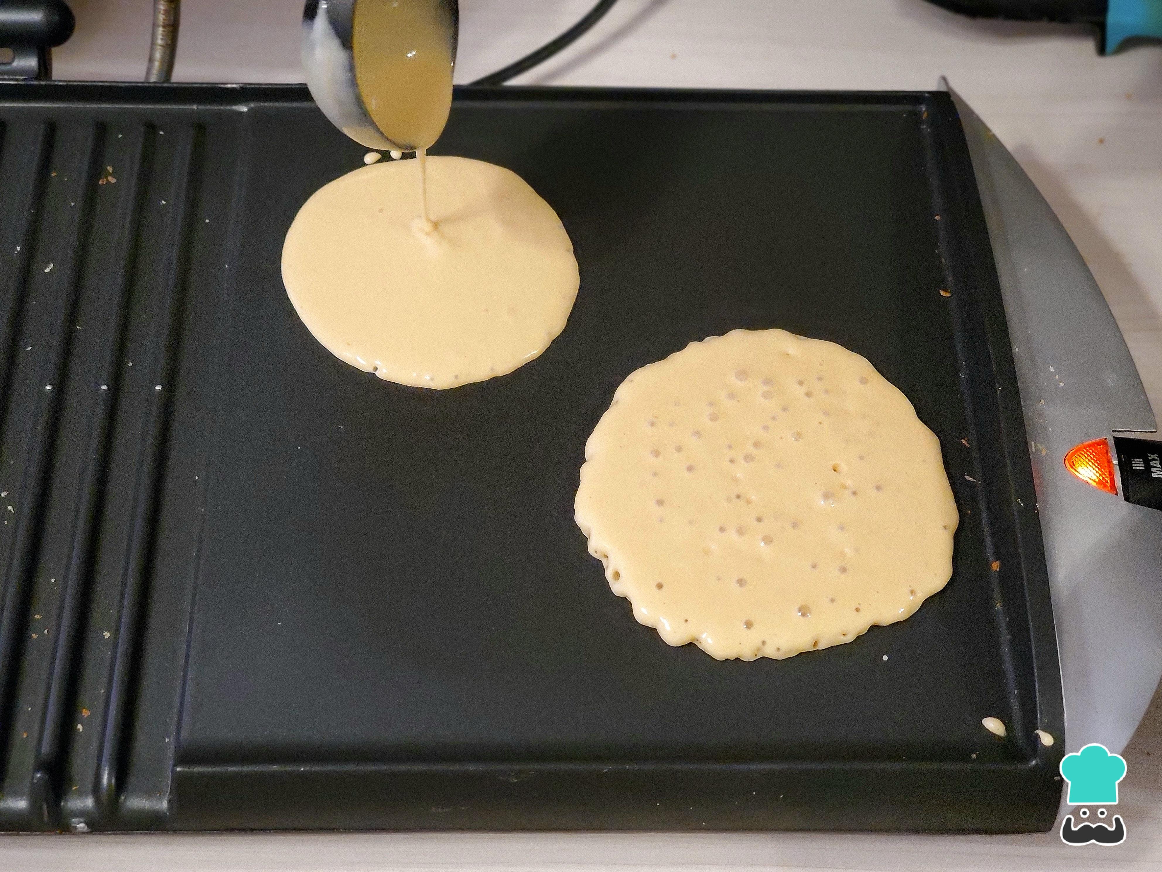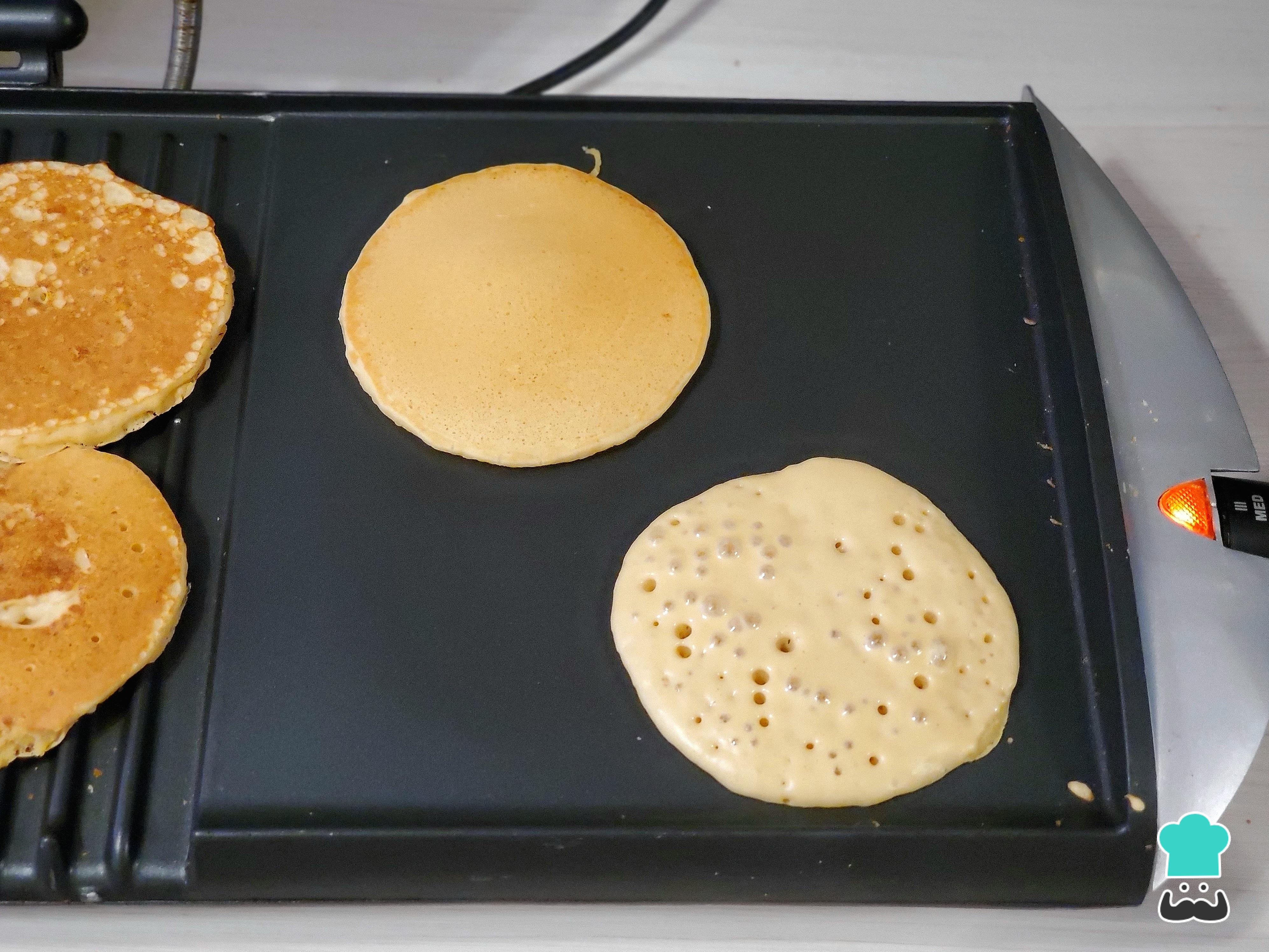 Después de un par de minutos notarás que se forman unas burbujas en las tortitas que se van reventando y secando, entonces introduce una espátula por debajo y proporciona la vuelta.