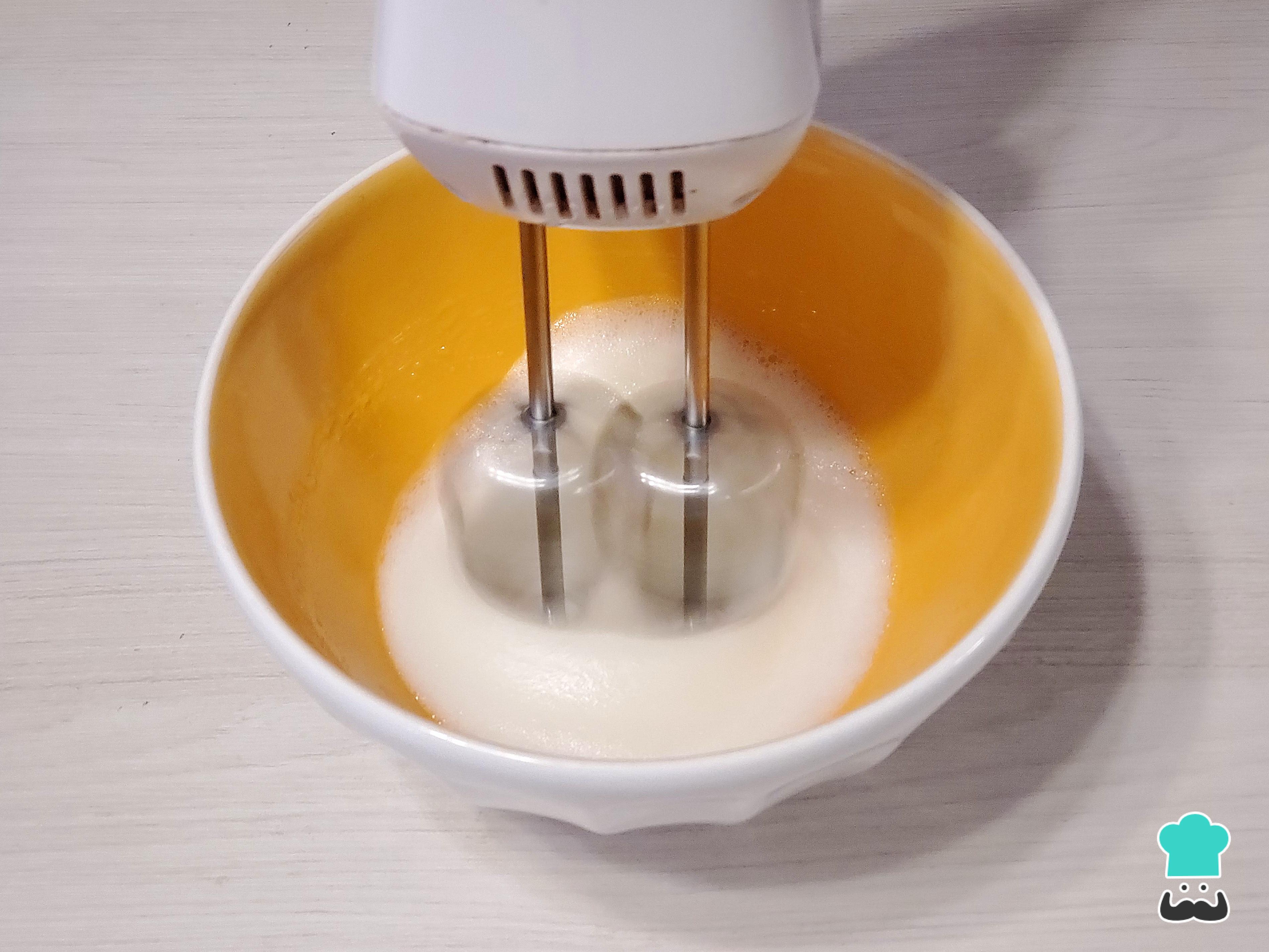 Empieza separando las claras de las yemas. Coloca las claras en un bowl mediano para poder batirlas cómodamente a punto de nieve (asegúrate de que el bowl esté bien limpio y seco). Luego, con una batidora eléctrica procede a batir aumentando la velocidad progresivamente hasta que se formen picos firmes. Reserva.
