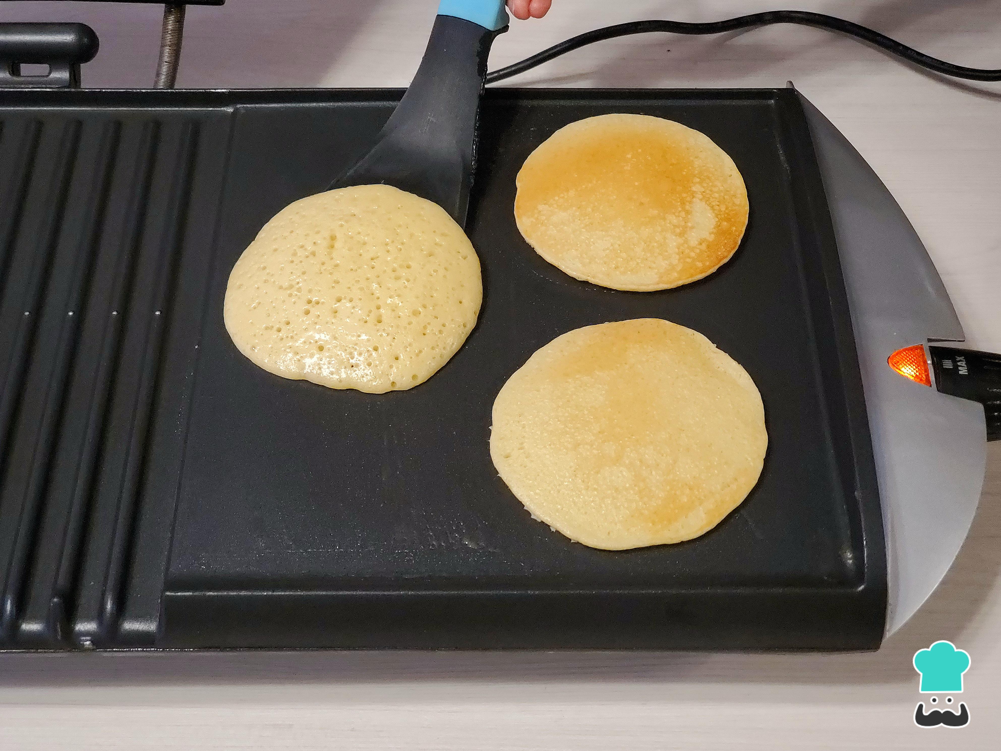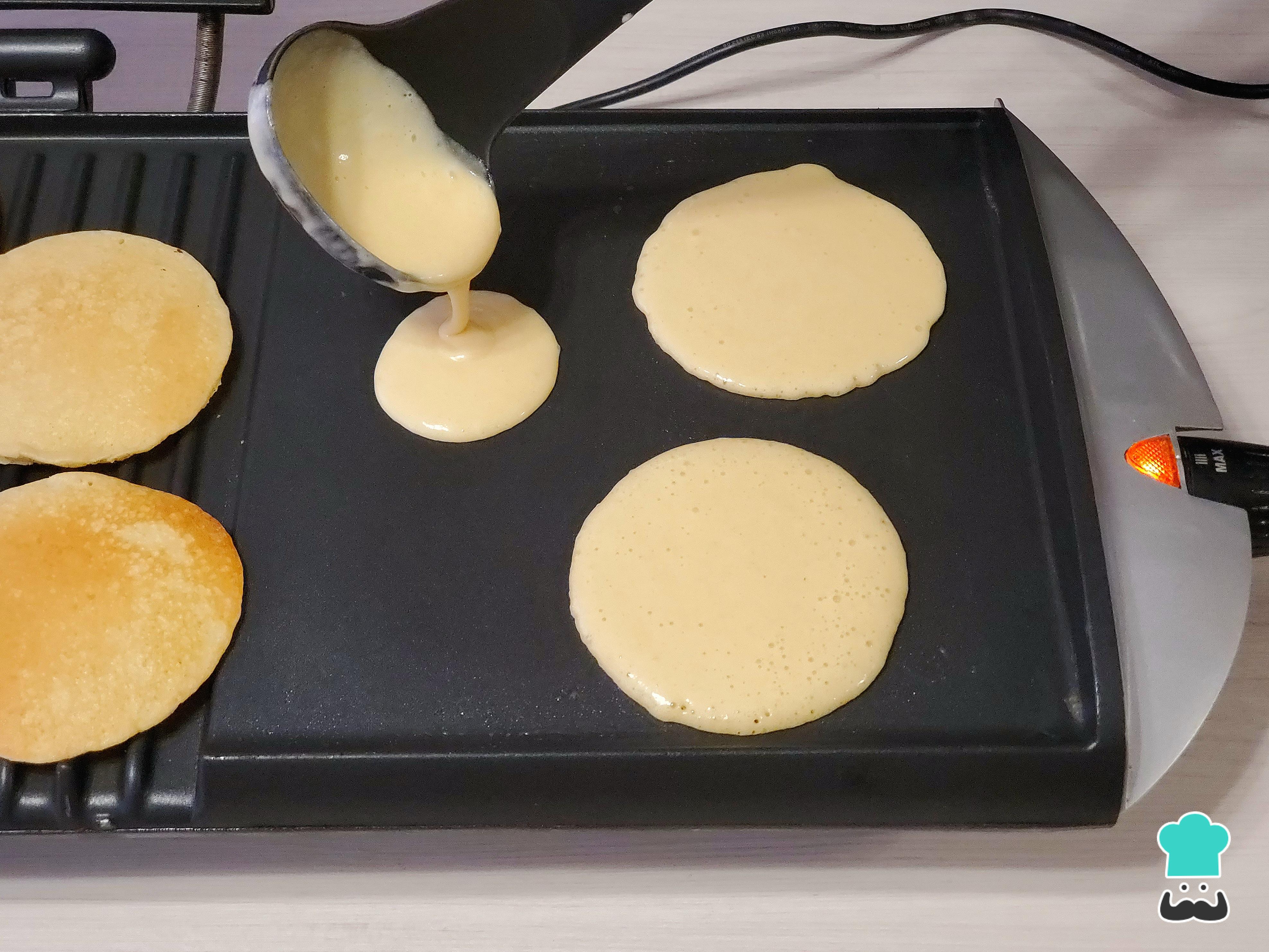 Calienta una plancha o una sartén antiadherente y, con un papel toalla distribuye un cubo pequeño de mantequilla hasta que se derrita y se forme una película muy fina. Con un cucharón vierte la masa proporcionando forma circular para hacer los pancakes.