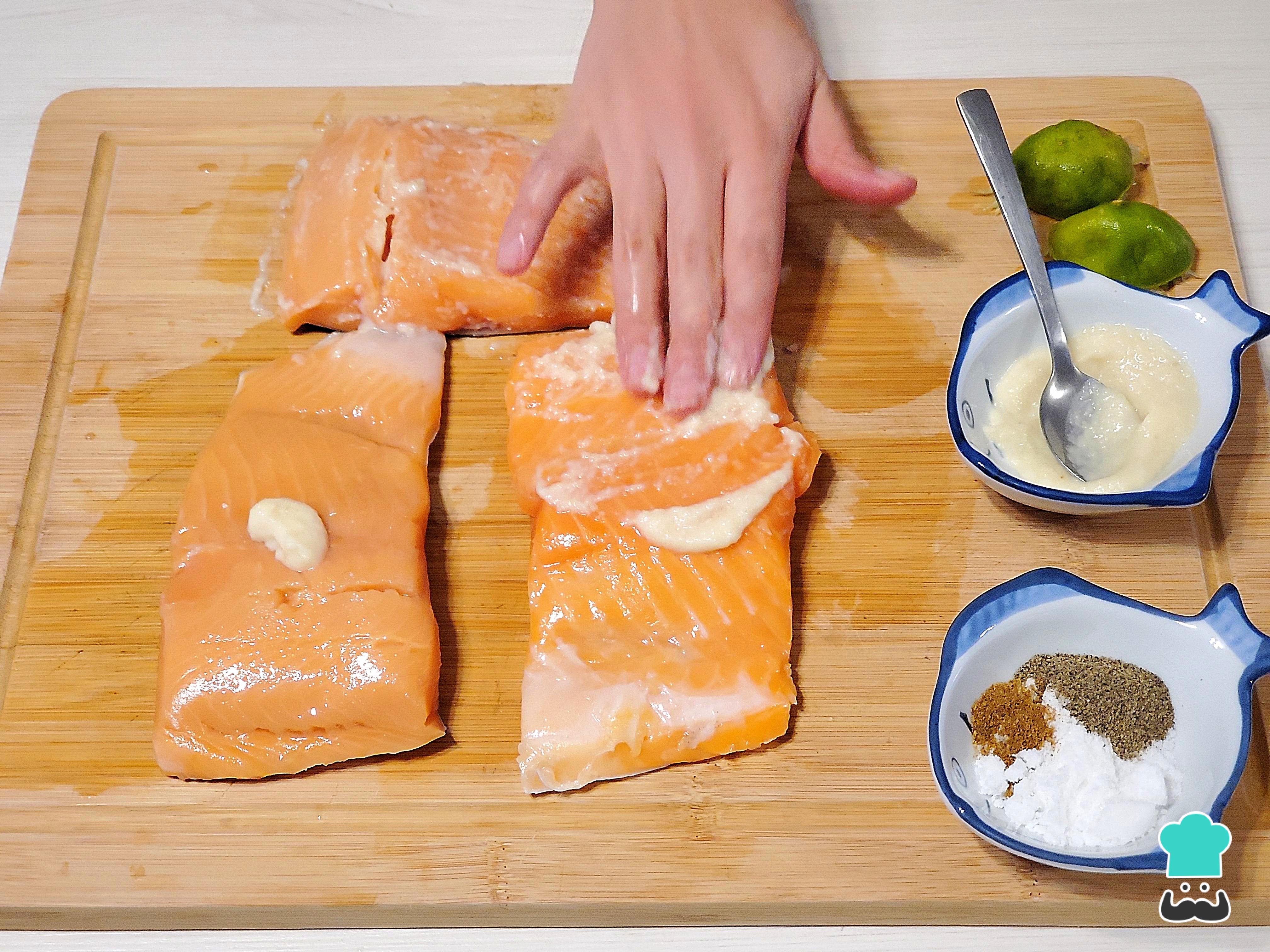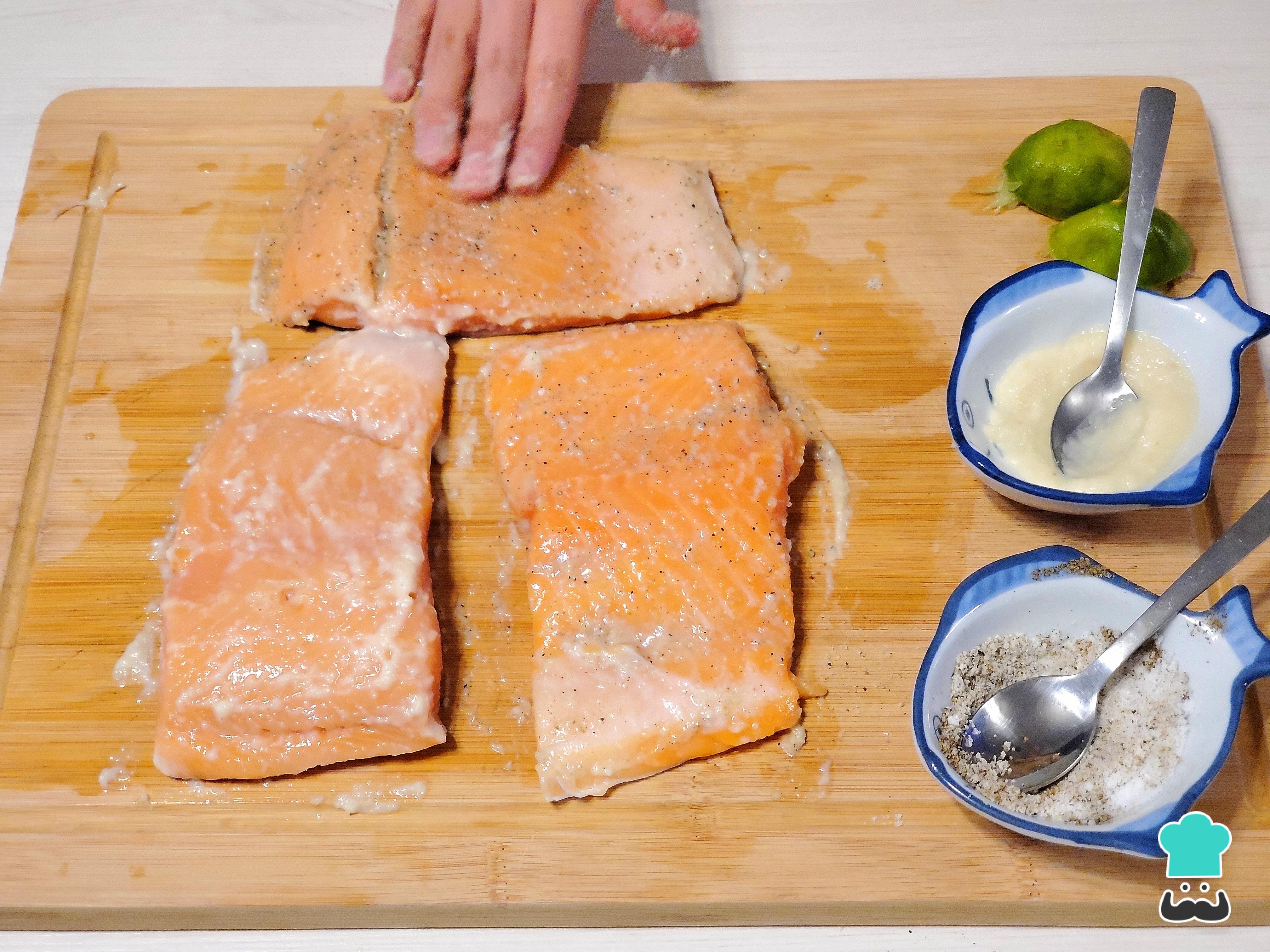 Vierte media cucharadita de ajo molido en cada filete y masajea con las manos para que se distribuya bien.