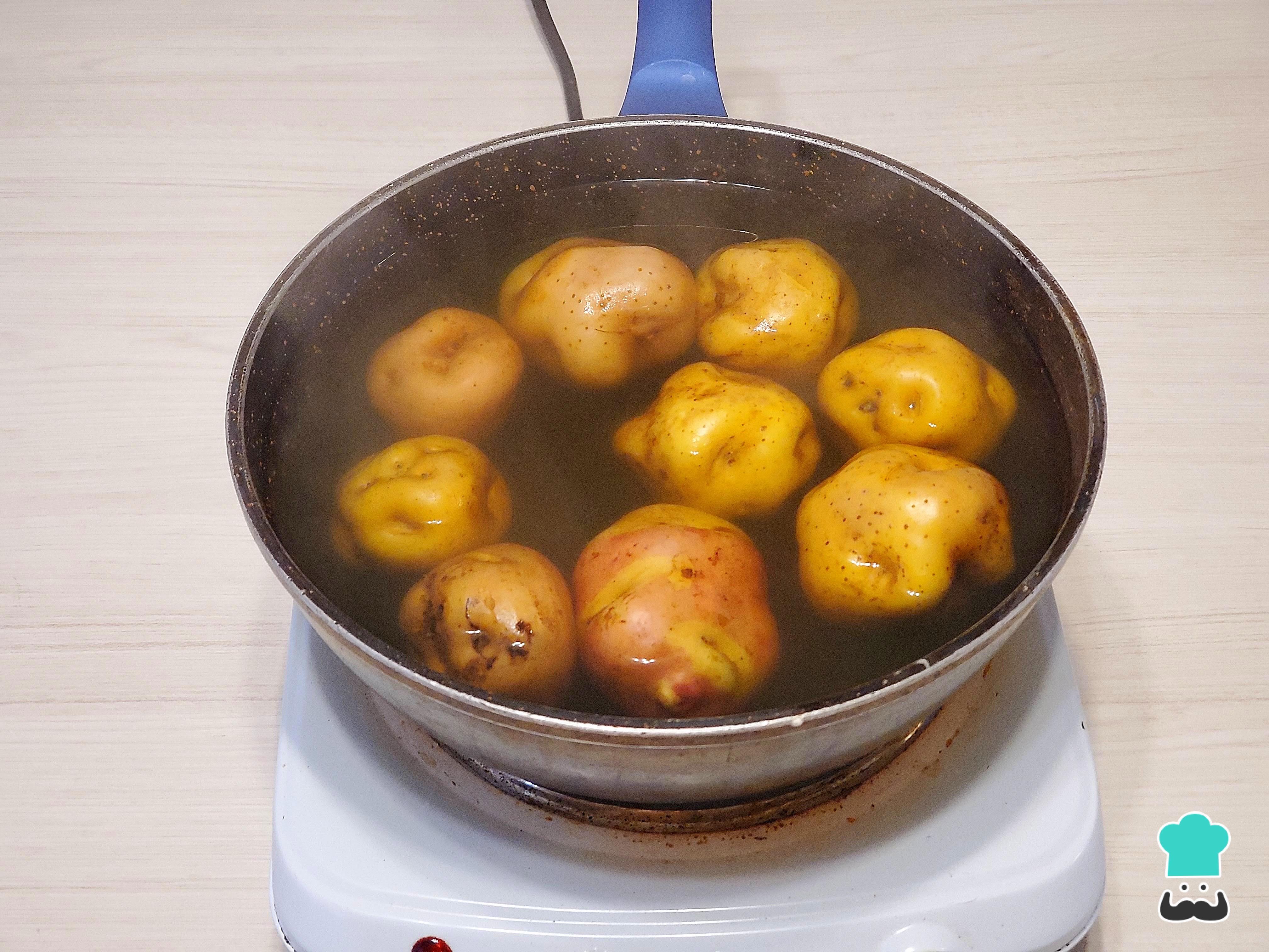 Para las guarniciones de la trucha, coloca las papas amarillas en una olla con abundante agua fría y un buen puñado de sal. Enciende el fuego y deja que se cocinen hasta estar suaves. Comprueba que están listas introduciendo un palillo o un cuchillo a las papas, debe insertar fácilmente. Después retíralas de la olla y déjalas que enfríen para proceder a pelarlas.