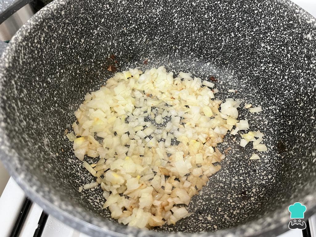 Para empezar con la preparación de estofado de carne para pastas, primero pela y pica la cebolla. Saltéala en una olla a fuego alto con una cucharada de aceite.