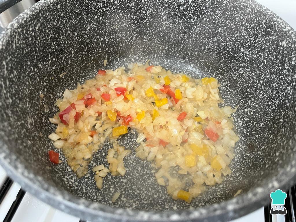 Cuando esté transparente, agrega el morrón previamente limpio, cortado en cubos y sin las nervaduras blancas ni las semillas. Puedes usar morrón verde, rojo, amarillo o una combinación de los 2. También puedes, en este punto, añadir 1 diente de ajo picado fino y/o zanahoria rallada. Baja el fuego a medio y cocina la verdura por unos 10 minutos. Si el salteado se está secando, añade unas cucharadas de agua caliente.