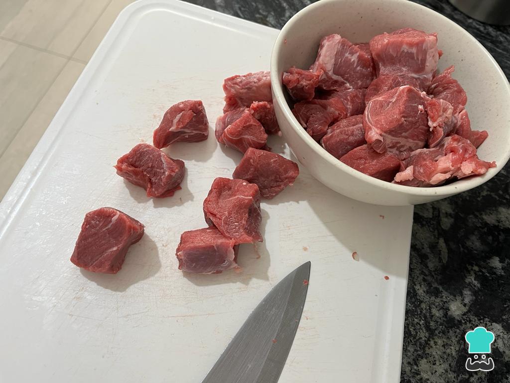 Mientras, retira la grasa visible de la carne y córtala en cubos del mismo tamaño.