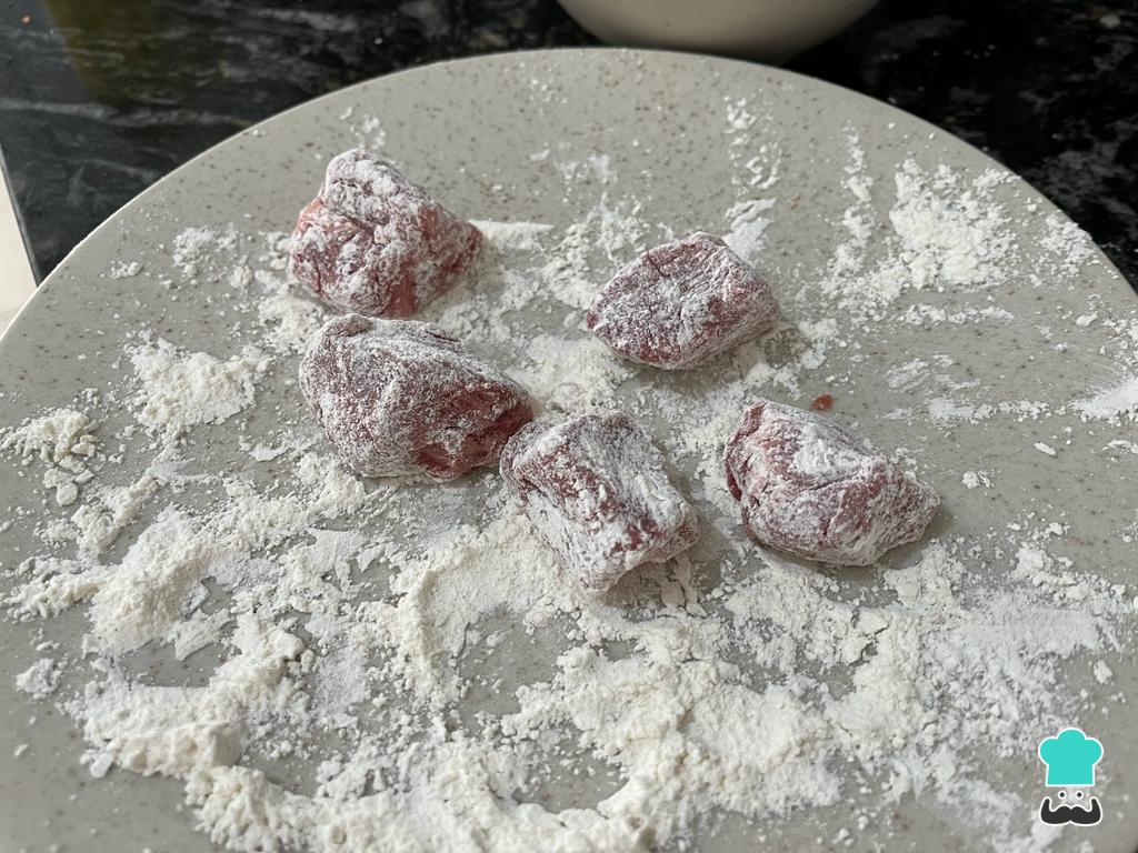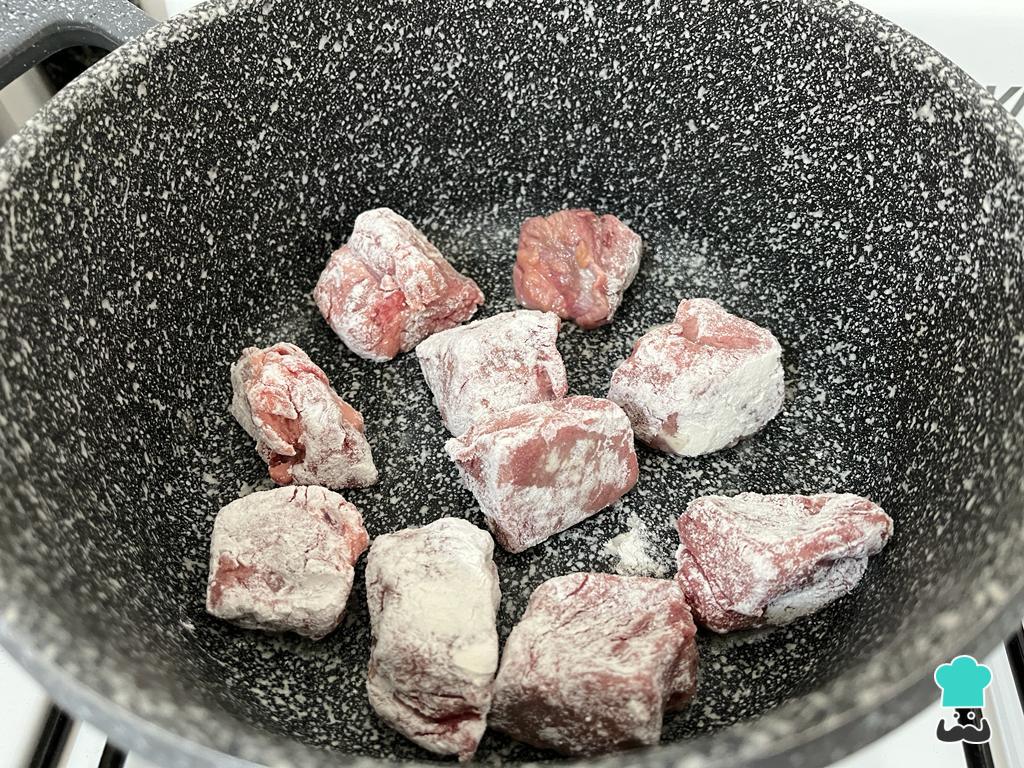 Dispón la harina en un plato para pasar cada cubo de carne por ella, como si quisieras rebozarla. Esto hará que la carne se selle, manteniendo la humedad en su interior y otorgando textura y sabor al tuco.