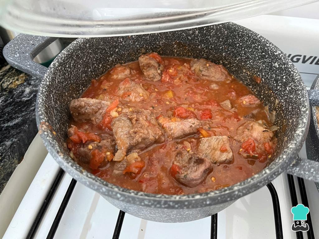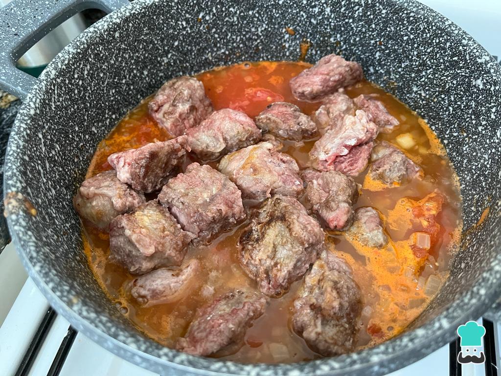 Cuando hayas sellado todos los cubos de carne, añade la verdura salteada previamente y la lata de tomates perita picados. También condimenta el tuco con carne con pimentón, ají molido y laurel. También puedes agregar otros condimentos como albahaca deshidratada, ajo en polvo, tomillo, orégano.