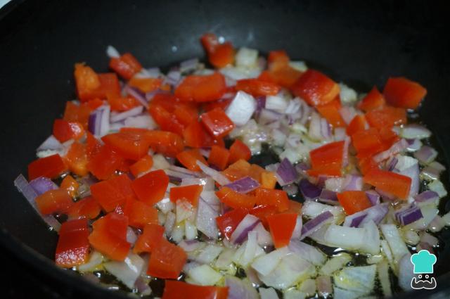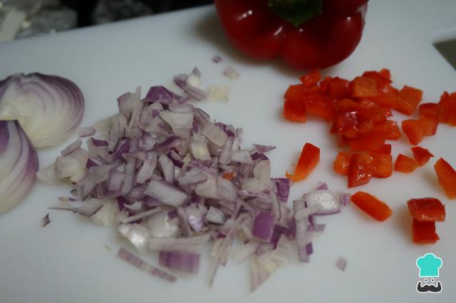 Pela y pica muy finita la cebolla, lava el pimiento rojo y trocéalo también muy pequeño.