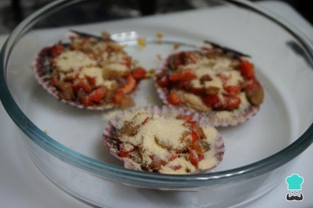 Espolvorea el pan rallado sobre las conchas. Gratina las vieiras a la marinera en el horno durante 10 minutos, o hasta que estén doradas, a 180 ºC.