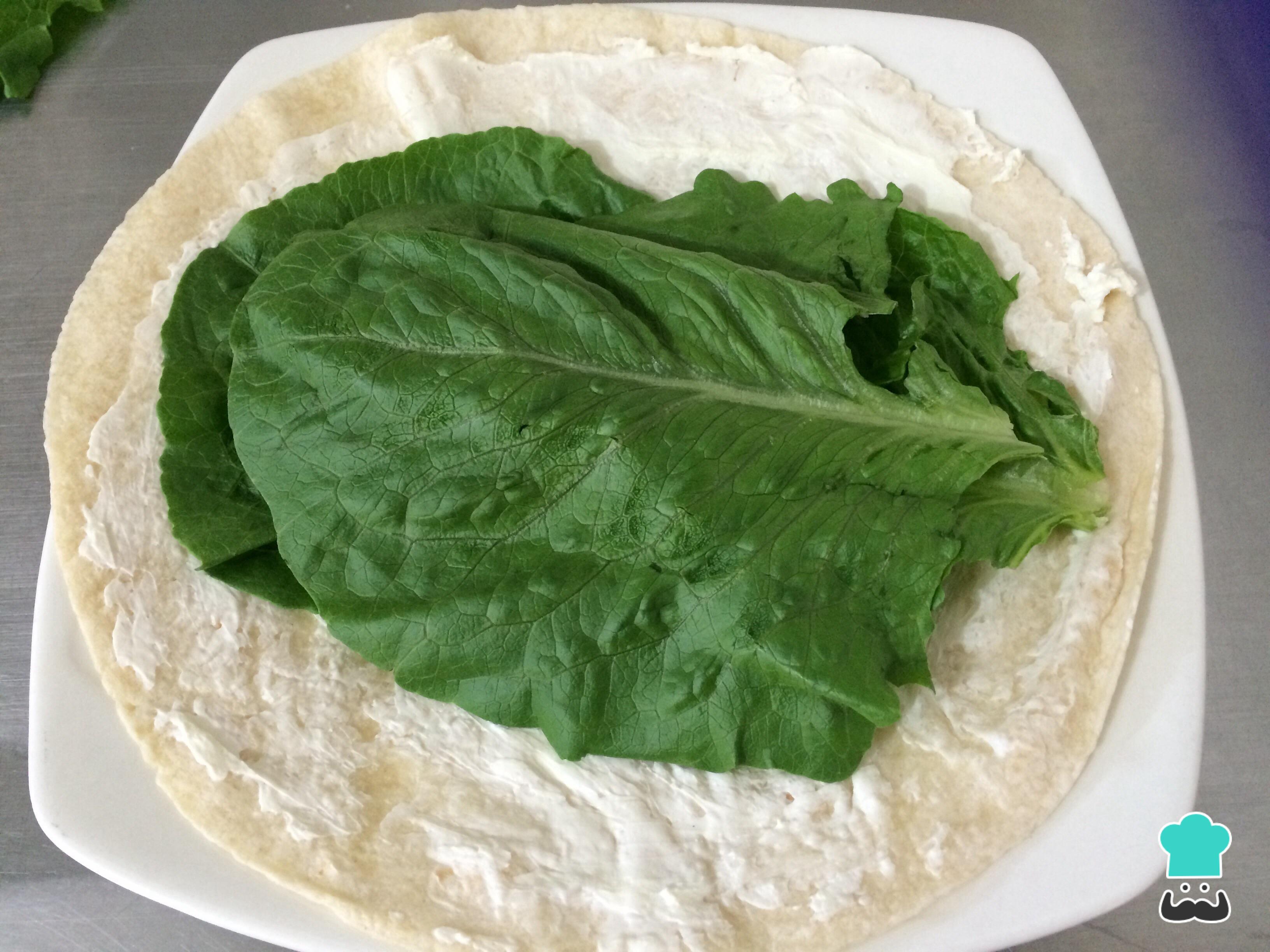Calentar la tortilla especial para wraps en una plancha, esparcir el queso crema y disponer las hojas de lechuga.
