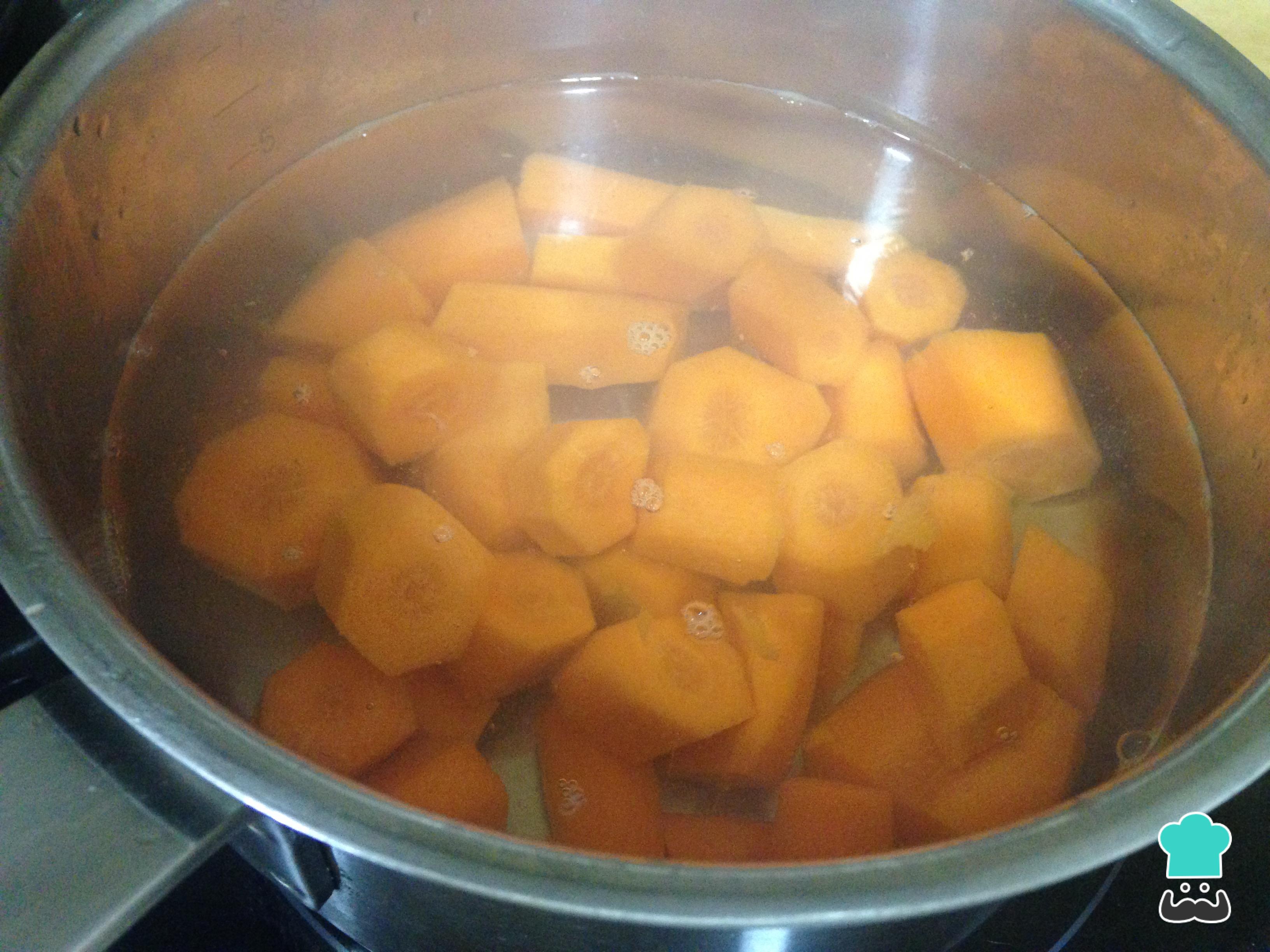 Pelamos y cocemos las zanahorias en trozos de unos 2 o 3 centímetros. Añadimos un poco de sal al agua de cocción y dejamos cocer durante 5 minutos.