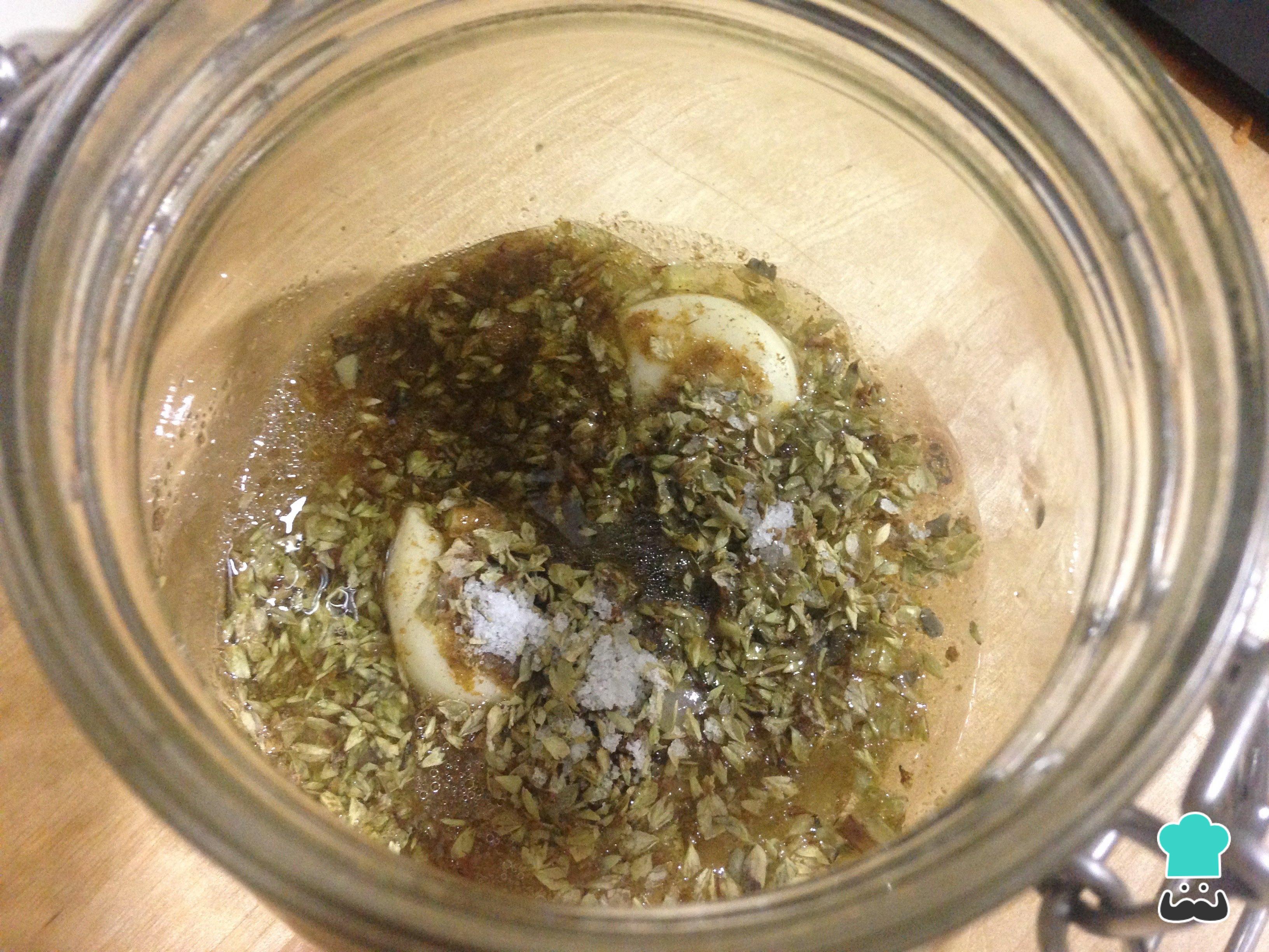 Mientras, preparamos el aliño: en un tarro o bote echamos los dientes de ajo (los podemos machacar o dejar enteros), las especias, una pizca de sal, vinagre y aceite de oliva.