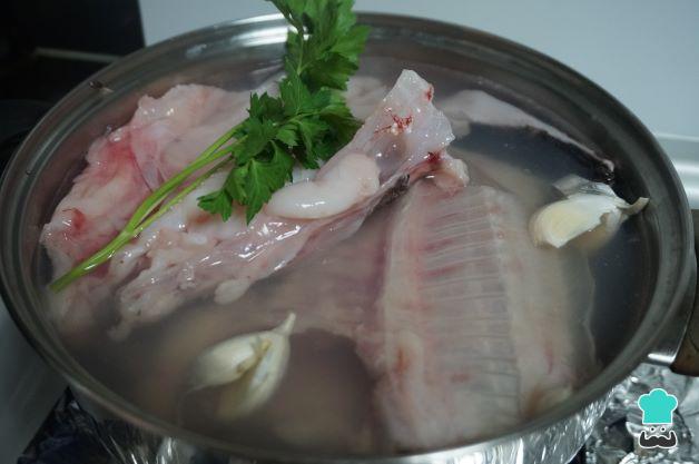 Primero prepara el caldo de pescado. Para ello, pide las espinas en la pescadería del pescado que compres. A continuación, añade una cazuela con 2 litros de agua, incorpora las espinas de pescado, unas ramas de perejil y dos dientes de ajos enteros, añade un poco de sal. Deja cocer durante 20 minutos y, cuando esté, apaga y reserva.