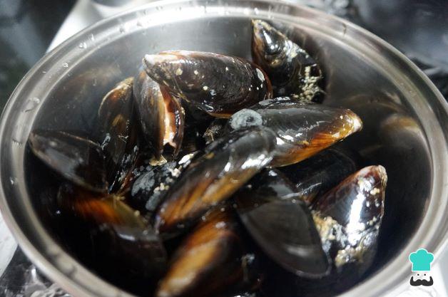 Cuece los mejillones en otro cazo y reserva el agua que suelta.
