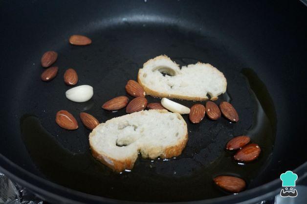 Fríe la picada. Añade una cazuela grande donde vayas a preparar la zarzuela de pescado de la abuela, un poco de aceite de oliva y pon los ingredientes de la picada. Dora los ingredientes sin que se quemen y ve retirando según se vayan tostando. Reserva.