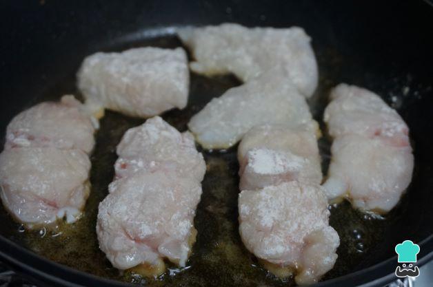 En la misma cazuela añade un poco más de aceite, pasa los trozos de pescado por harina y fríe a fuego fuerte el pescado, solo sellarlo. Reserva.