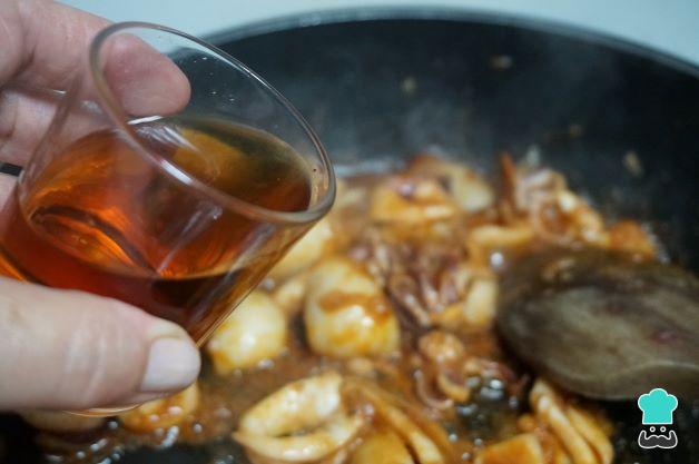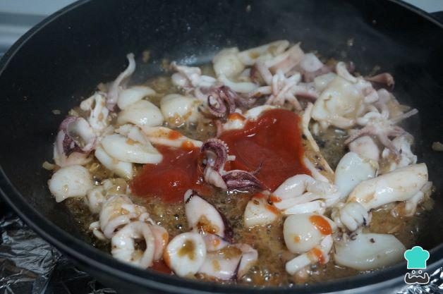 Pela y pica la cebolla. En la misma cazuela ve añadiendo aceite según veas que hace falta. A continuación, pon la cebolla a pochar a fuego medio y, a medio pochar, añade los calamares limpios y cortados en trozos. Deja que se cocine todo 5 minutos. Añade el tomate y la carne de ñora, mezcla y deja se cocine todo unos minutos.